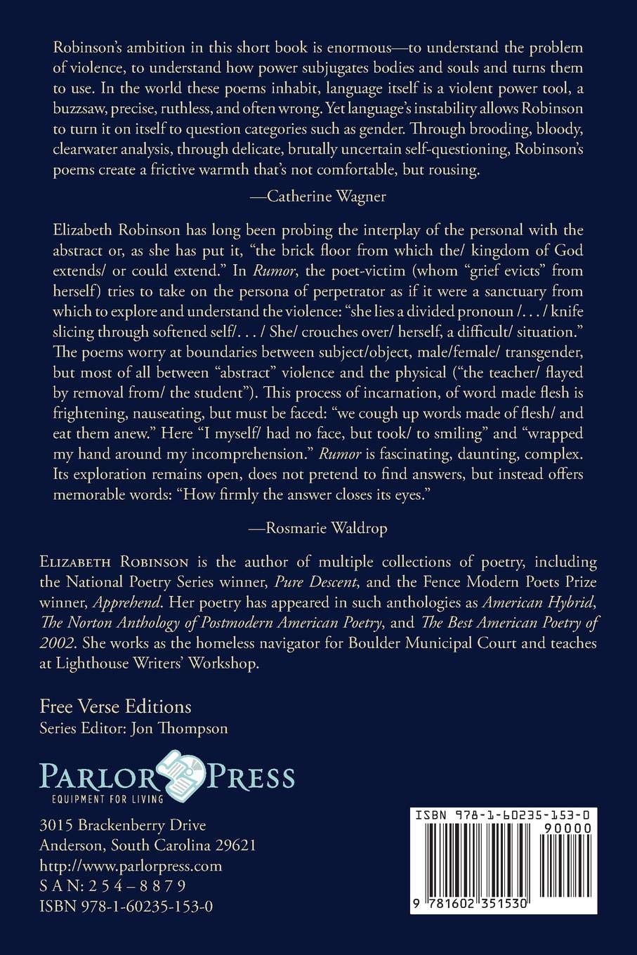 What is the dividing line between ugly and beautiful, aggressive and resigned? How does one demarcate the fluid boundaries of gender? Between the idiosyncratically local and the universal? In Rumor, Elizabeth Robinson spins out the narrative line of a series of unsolved Victorian murders. Here, what cannot be known, what can only be rumored, emerges as the greatest ethical challenge. These poems undertake the transgression of the irresolvable.
