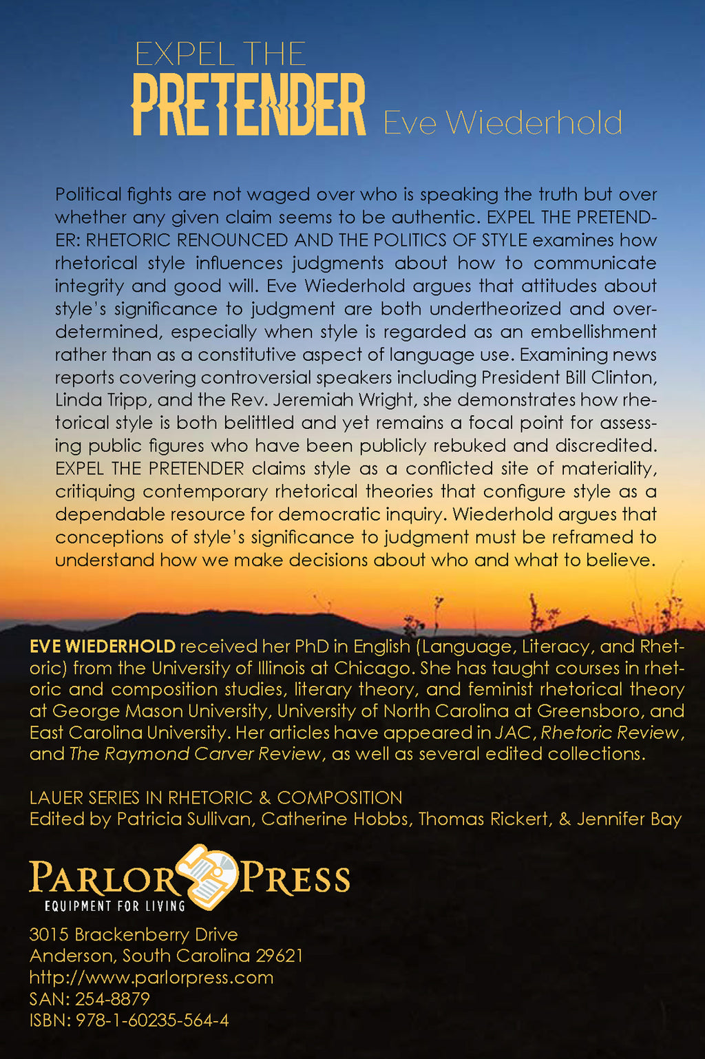 Political fights are not waged over who is speaking the truth but over whether any given claim seems to be authentic. Expel the Pretender: Rhetoric Renounced and the Politics of Style examines how rhetorical style influences judgments about how to communicate integrity and good will. Eve Wiederhold argues that attitudes about style's significance to judgment are both undertheorized and over-determined, especially when style is regarded as an embellishment rather than as a constitutive aspect of language use. Examining news reports covering controversial speakers including President Bill Clinton, Linda Tripp, and the Rev. Jeremiah Wright, she demonstrates how rhetorical style is both belittled and yet remains a focal point for assessing public figures who have been publicly rebuked and discredited. Expel the Pretender claims style as a conflicted site of materiality, critiquing contemporary rhetorical theories that configure style as a dependable resource for democratic inquiry. Wiederhold argues that conceptions of style's significance to judgment must be reframed to understand how we make decisions about who and what to believe.