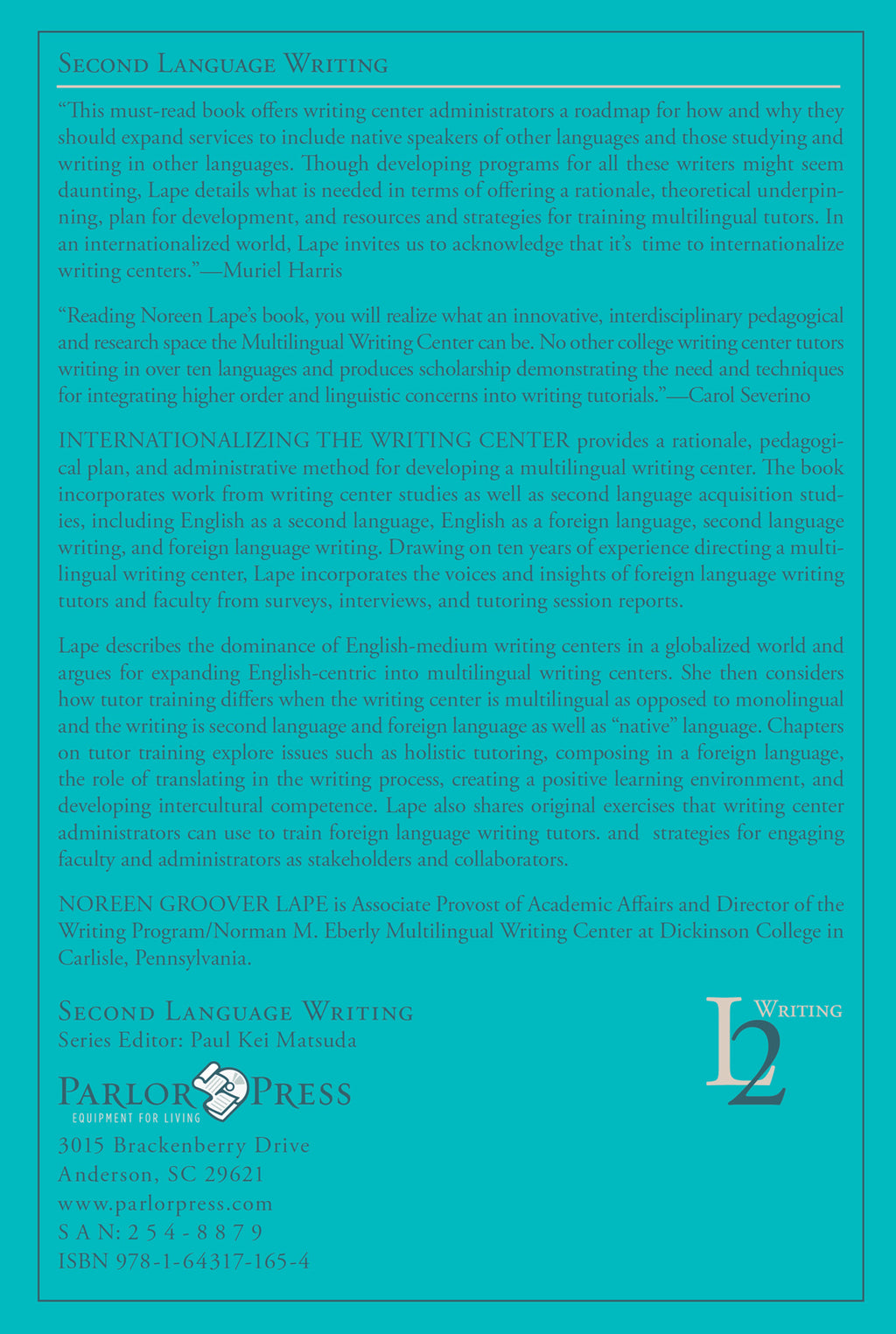“This must-read book offers writing center administrators a roadmap for how and why they should expand services to include native speakers of other languages and those studying and writing in other languages. Though developing programs for all these writers might seem daunting, Lape details what is needed in terms of offering a rationale, theoretical underpinning, plan for development, and resources and strategies for training multilingual tutors. In an internationalized world, Lape invites us to acknowledge that it’s time to internationalize writing centers.”—Muriel Harris