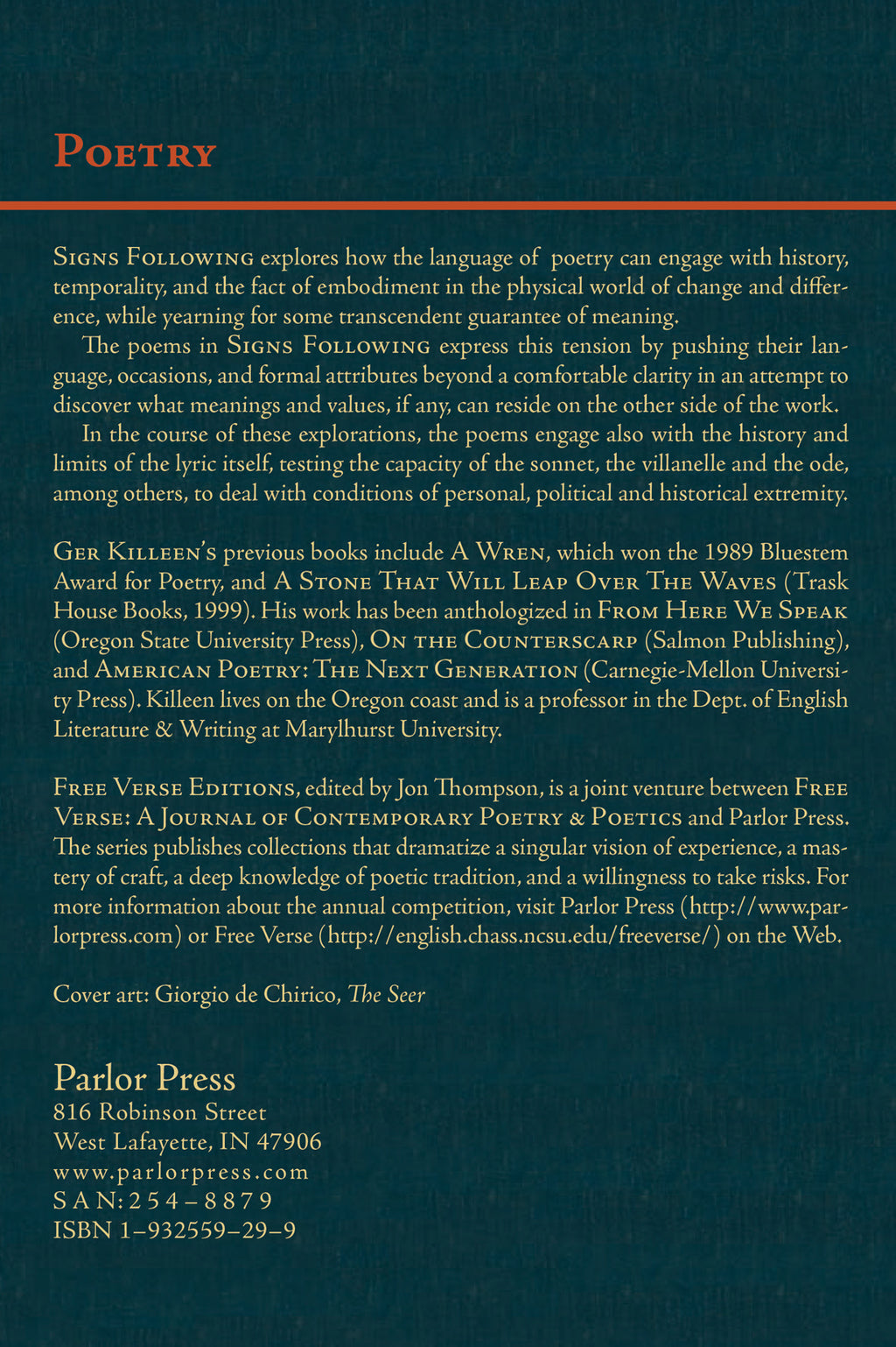 Signs Following explores how the language of poetry can engage with history, temporality, and the fact of embodiment in the physical world of change and difference, while yearning for some transcendent guarantee of meaning.