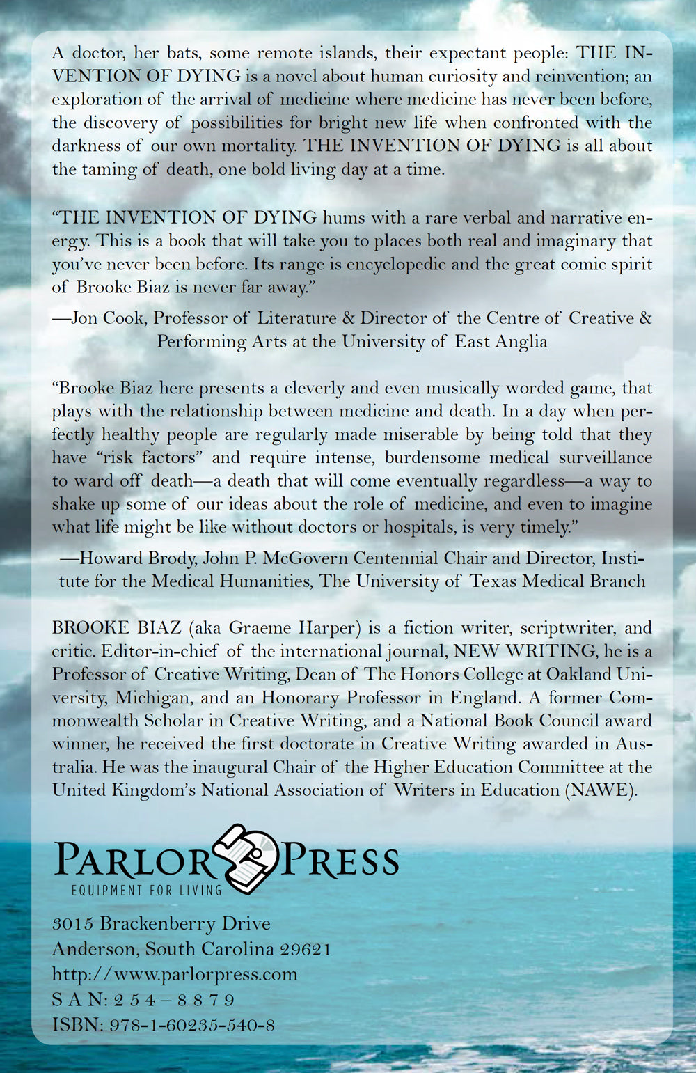 A doctor, her bats, some remote islands, their people: The Invention of Dying is a novel about searching, an exploration  of the arrival of medicine where medicine has never been before, an embracing of life where one life has never known other lives. The Invention of Dying explores how we invent life and in doing so invent both our ends and, excitingly, our beginnings—one day at a time.