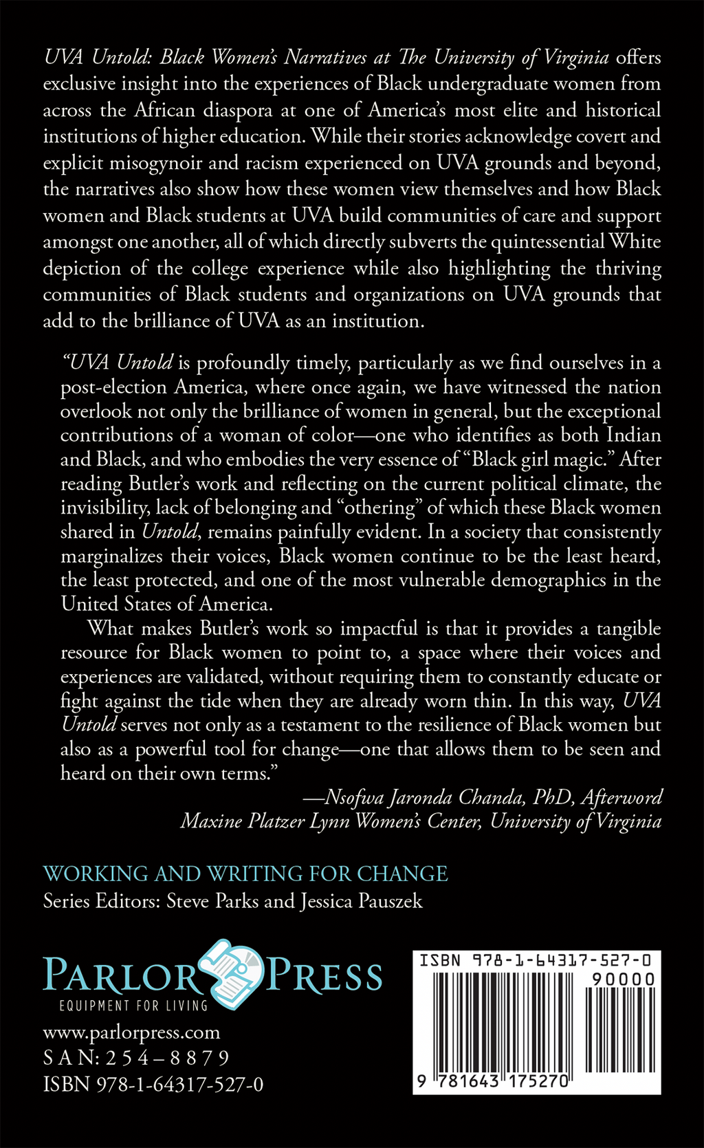 UVA Untold: Black Women’s Narratives at The University of Virginia offers exclusive insight into the experiences of Black undergraduate women from across the African diaspora at one of America’s most elite and historical institutions of higher education. While their stories acknowledge covert and explicit misogynoir and racism experienced on UVA grounds and beyond, the narratives also show how these women view themselves and how Black women and Black students at UVA build communities of care and support amongst one another, all of which directly subverts the quintessential White depiction of the college experience while also highlighting the thriving communities of Black students and organizations on UVA grounds that add to the brilliance of UVA as an institution.