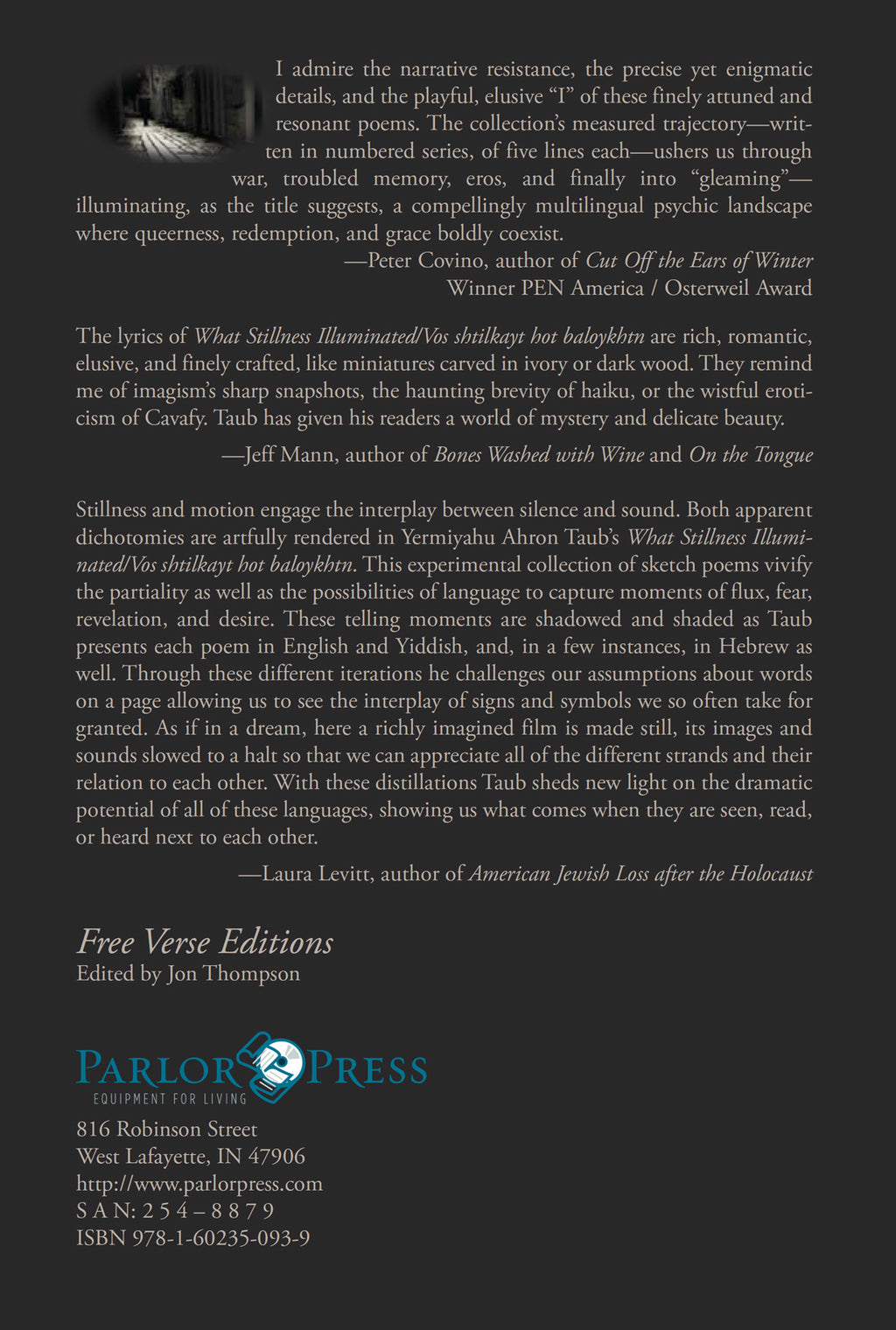 Inspired by the poet’s experience as an artist’s model, What Stillness Illuminated/Vos shtilkayt hot baloykhtn  is a kaleidoscope of mysterious tableaux vivants.  Composed entirely of five-line poems, the book offers glimpses of individuals in moments of flux or revelation and suggestions of lives altered.  By drawing on the dramatic potential inherent in brevity, Yermiyahu Ahron Taub invites the reader to extend the narratives beyond the borders of the poems to imagined conclusions of their own.  What Stillness Illuminated/Vos shtilkayt hot baloykhtn is written in English and Yiddish, with two poems also in Hebrew.