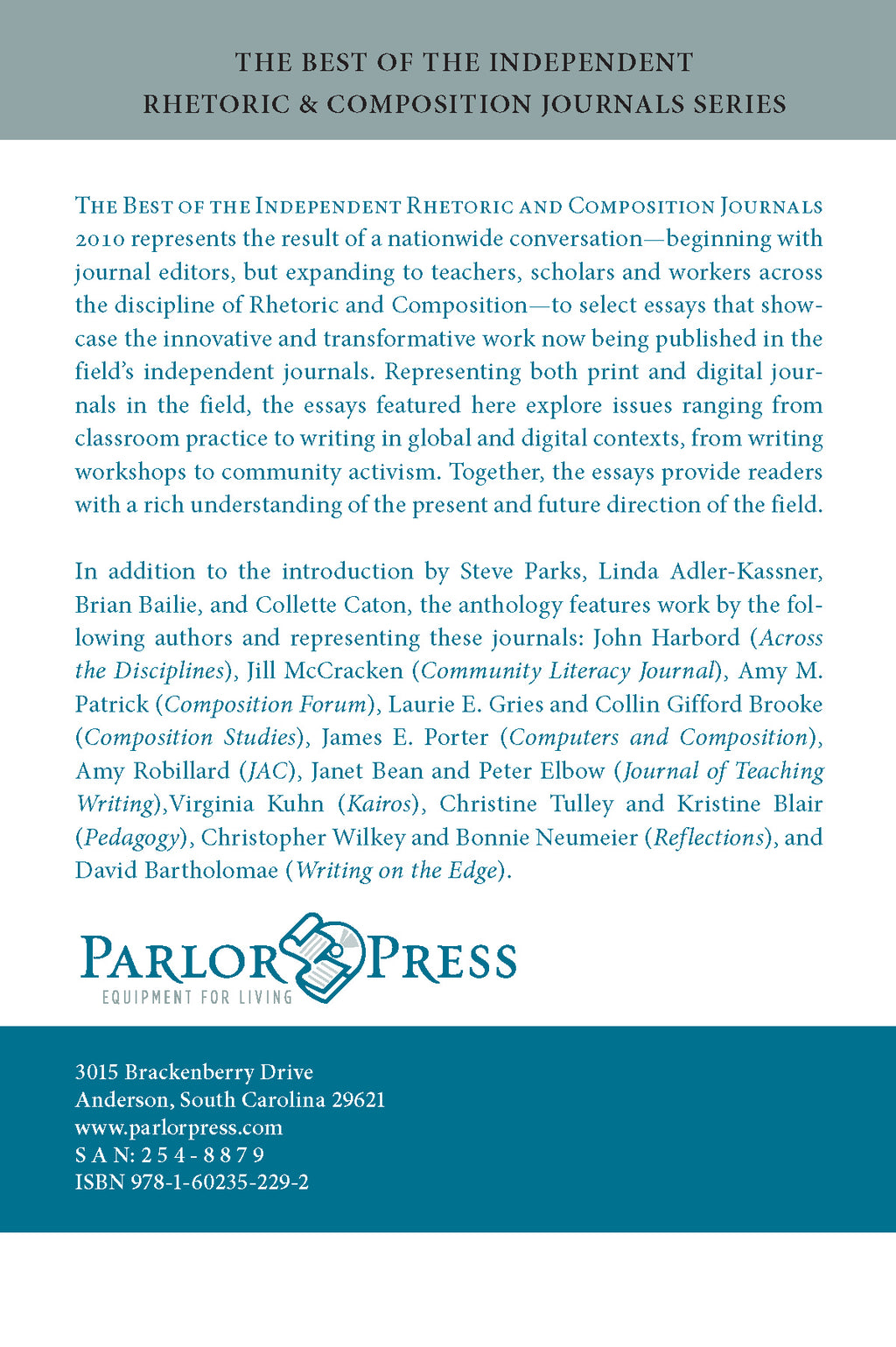 The Best of the Independent Rhetoric and Composition Journals 2010 represents the result of a nationwide conversation—beginning with journal editors, but expanding to teachers, scholars and workers across the discipline of Rhetoric and Composition—to select essays that showcase the innovative and transformative work now being published in the field's independent journals. Representing both print and digital journals in the field, the essays featured here explore issues ranging from classroom practice to writing in global and digital contexts, from writing workshops to community activism. Together, the essays provide readers with a rich understanding of the present and future direction of the field.