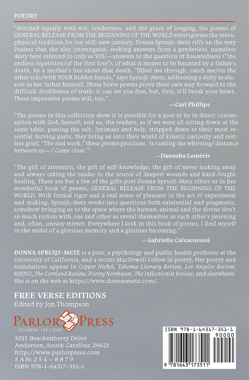 “Stitched equally with wit, tenderness, and the grace of longing, the poems of GENERAL RELEASE FROM THE BEGINNING OF THE WORLD reinvigorate the metaphysical tradition for our still-new century. Donna Spruijt-Metz riffs on the very Psalms that she also interrogates, seeking answers from a genderless, nameless deity here referred to only as YOU—answers to the question of hauntedness (“the endless repetition/of the first loss”), of what it means to be haunted by a father’s death, by a mother’s lies about that death. “[R]eel me through, catch me/on the other side/with YOUR hidden hands,” says Spruijt-Metz, addressing a deity as elusive as her father himself. These brave poems prove their own way forward to the difficult doubleness of truth: it can set you free, but, first, it’ll break your heart. These impressive poems will, too.” —Carl Phillips