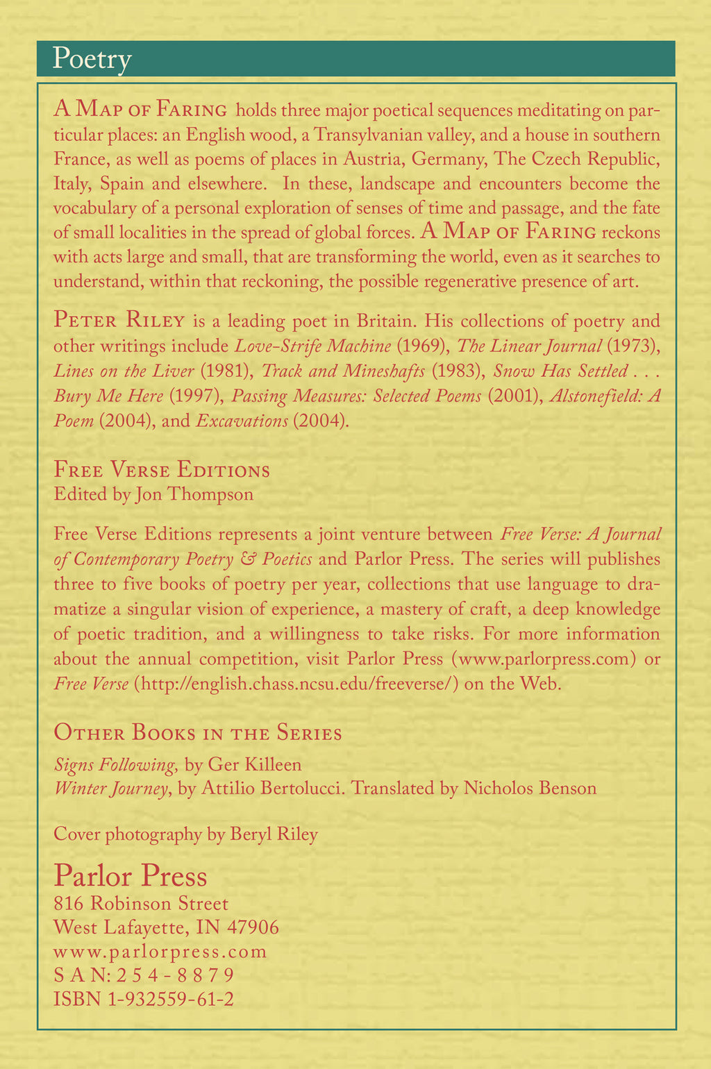 "Peter Riley's most recent full-length poetry collection, A Map of Faring, is precisely the sort of project that is helping to distinguish the newly established Free Verse Editions, a joint venture between Free Verse and Parlor Press. With its commitment to featuring translations, combined with an international scope, Free Verse Editions has been consistently proving that the site of contemporary poetry consists not so much of place, but of places and their rich, adjacent terrains."