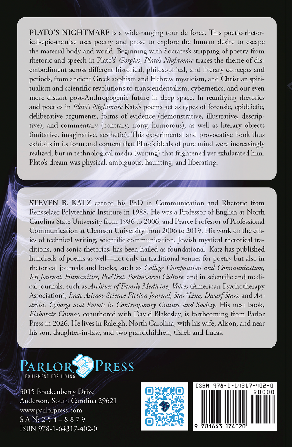 Plato’s Nightmare is a wide-ranging tour de force. This poetic-rhetorical-epic-treatise uses poetry and prose to explore the human desire to escape the material body and world. Beginning with Socrates’s stripping of poetry from rhetoric and speech in Plato’s’ Gorgias, Plato’s Nightmare traces the theme of disembodiment across different historical, philosophical, and literary concepts and periods, from ancient Greek sophism and Hebrew mysticism, and Christian spiritualism and scientific revolutions to transcendentalism, cybernetics, and our even more distant post-Anthropogenic future in deep space. In reunifying rhetorics and poetics in Plato’s Nightmare Katz’s poems act as types of forensic, epideictic, deliberative arguments, forms of evidence (demonstrative, illustrative, descriptive), and commentary (contrary, irony, humorous), as well as literary objects (imitative, imaginative, aesthetic). This experimental and provocative book thus exhibits in its form and content that Plato’s ideals of pure mind were increasingly realized, but in technological media (writing) that frightened yet exhilarated him. Plato’s dream was physical, ambiguous, haunting, and liberating.