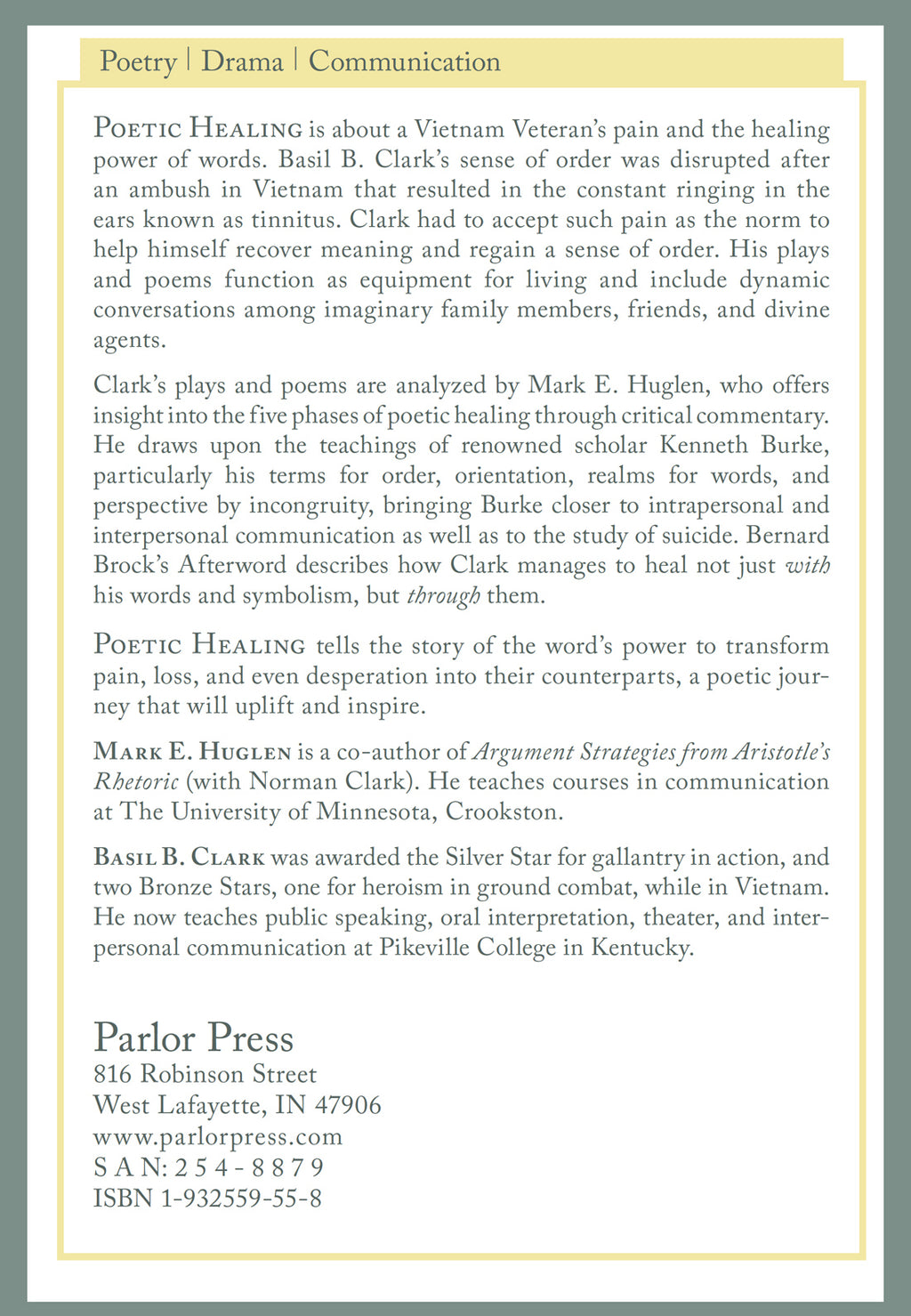 Poetic Healing is about a Vietnam Veteran’s pain and the healing power of words. Basil B. Clark’s sense of order was disrupted after an ambush in Vietnam that resulted in the constant ringing in the ears known as tinnitus. Clark had to accept such pain as the norm to help himself recover meaning and regain a sense of order. His plays and poems function as equipment for living and include dynamic conversations among imaginary family members, friends, and divine agents.