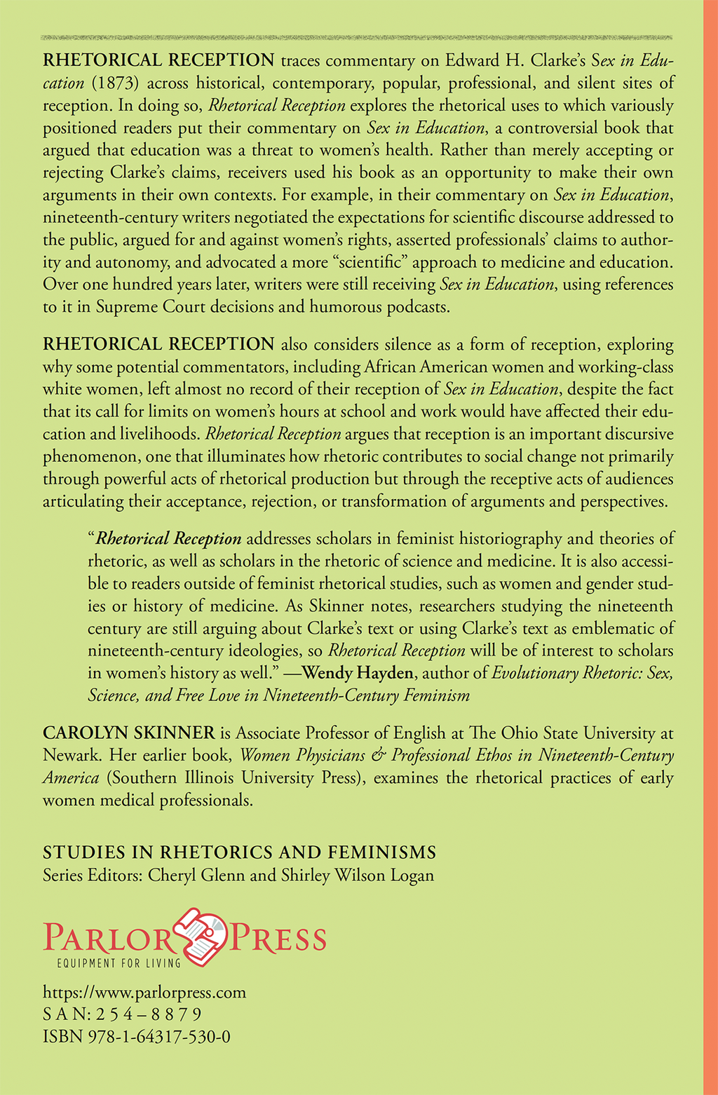 Rhetorical Reception addresses scholars in feminist historiography and theories of rhetoric, as well as scholars in the rhetoric of science and medicine. It is also accessible to readers outside of feminist rhetorical studies, such as women and gender studies or the history of medicine. As Skinner notes, researchers studying the nineteenth century are still arguing about Clarke’s text or using Clarke’s text as emblematic of nineteenth-century ideologies, so Rhetorical Reception will be of interest to scholars in women’s history as well.—Wendy Hayden, author of Evolutionary Rhetoric: Sex, Science, and Free Love in Nineteenth-Century Feminism