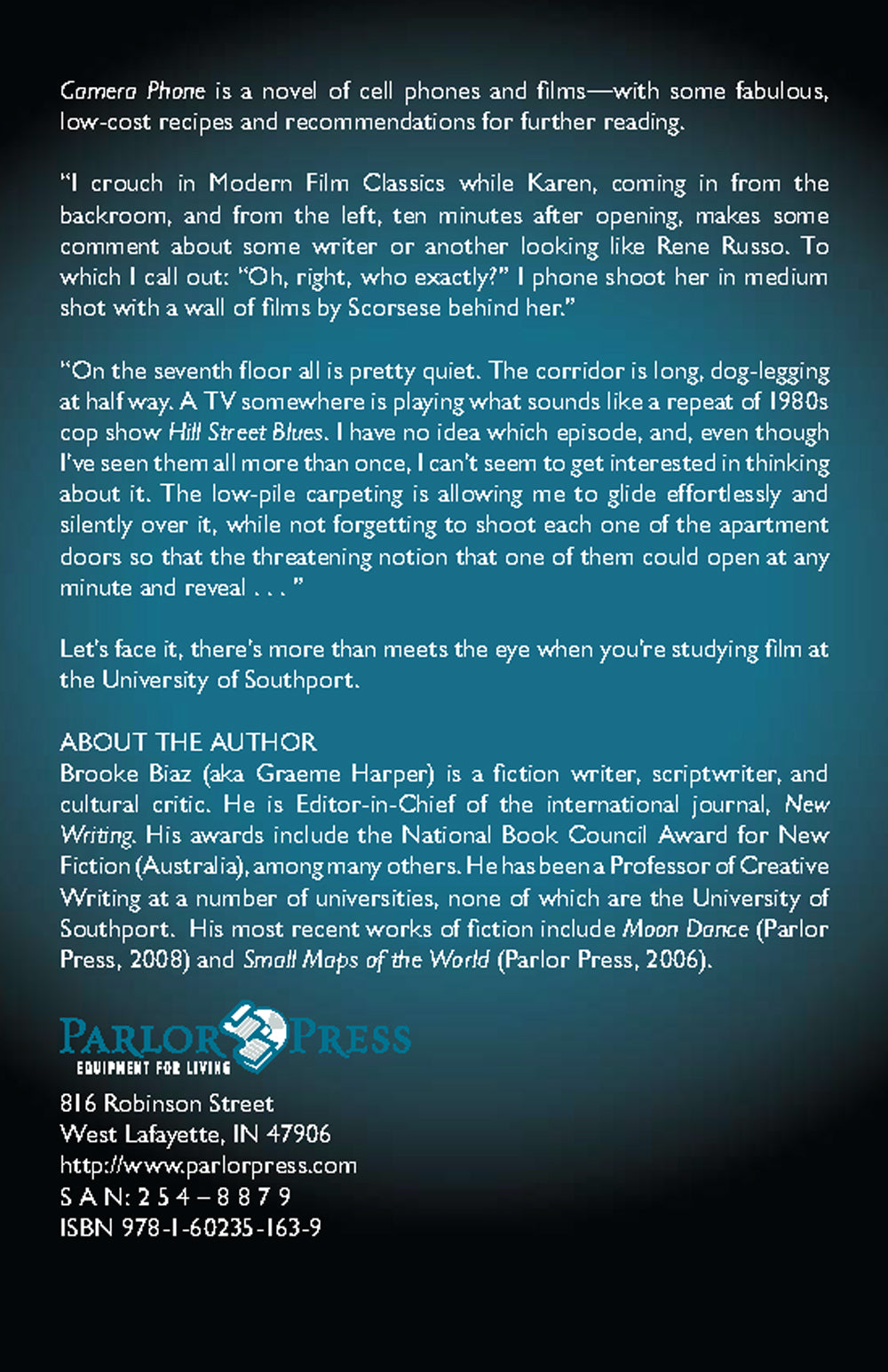Camera Phone is a novel of cell phones and films—with some fabulous, low-cost recipes and recommendations for further reading. Let's face it, there's more than meets the eye when you're studying film at the University of Southport.
