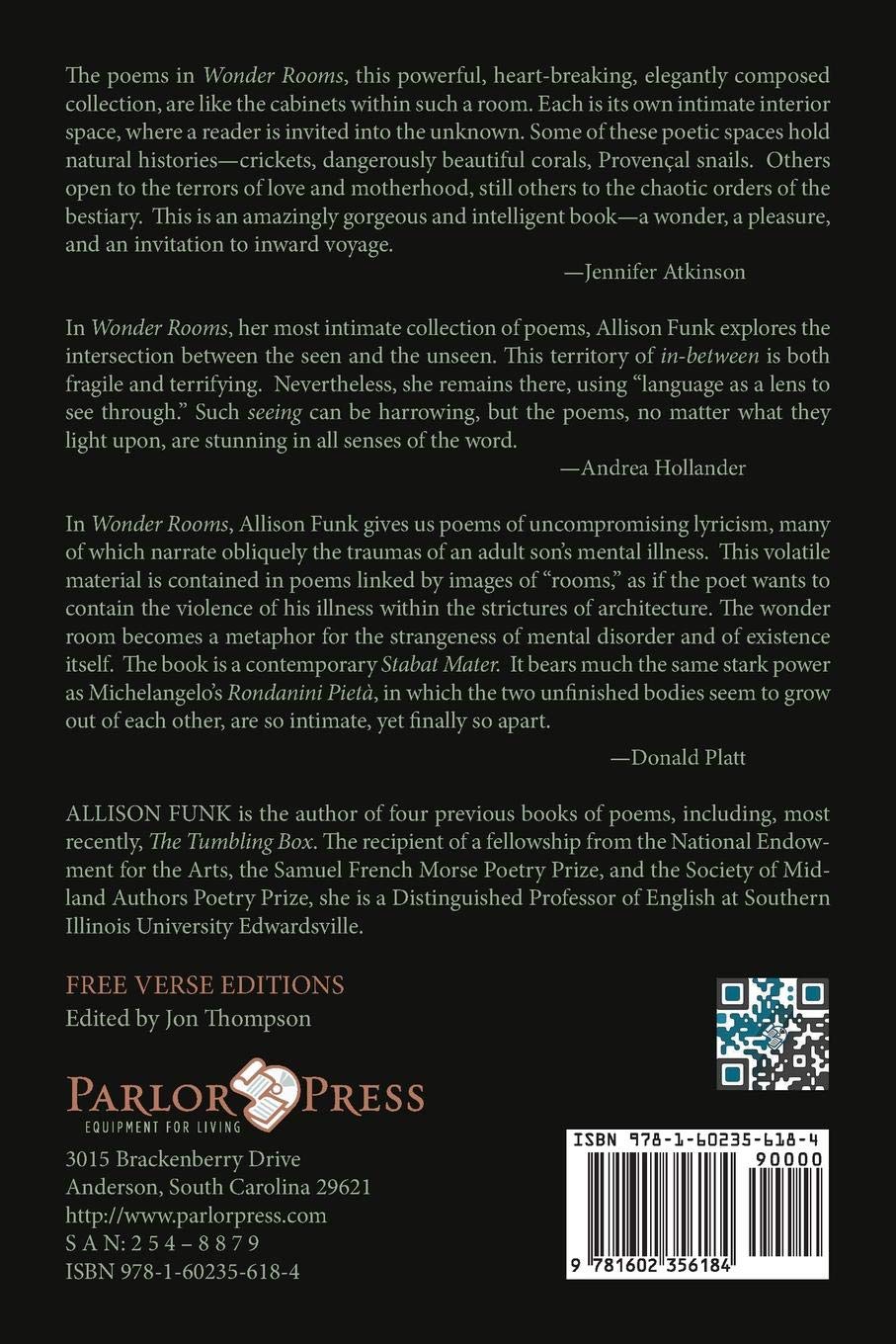 "In Wonder Rooms, her most intimate collection of poems, Allison Funk explores the intersection between the seen and the unseen. This territory of in-between is both fragile and terrifying. Nevertheless, she remains there, using "language as a lens to see through." Such seeing can be harrowing, but the poems, no matter what they light upon, are stunning in all senses of the word." —Andrea Hollander