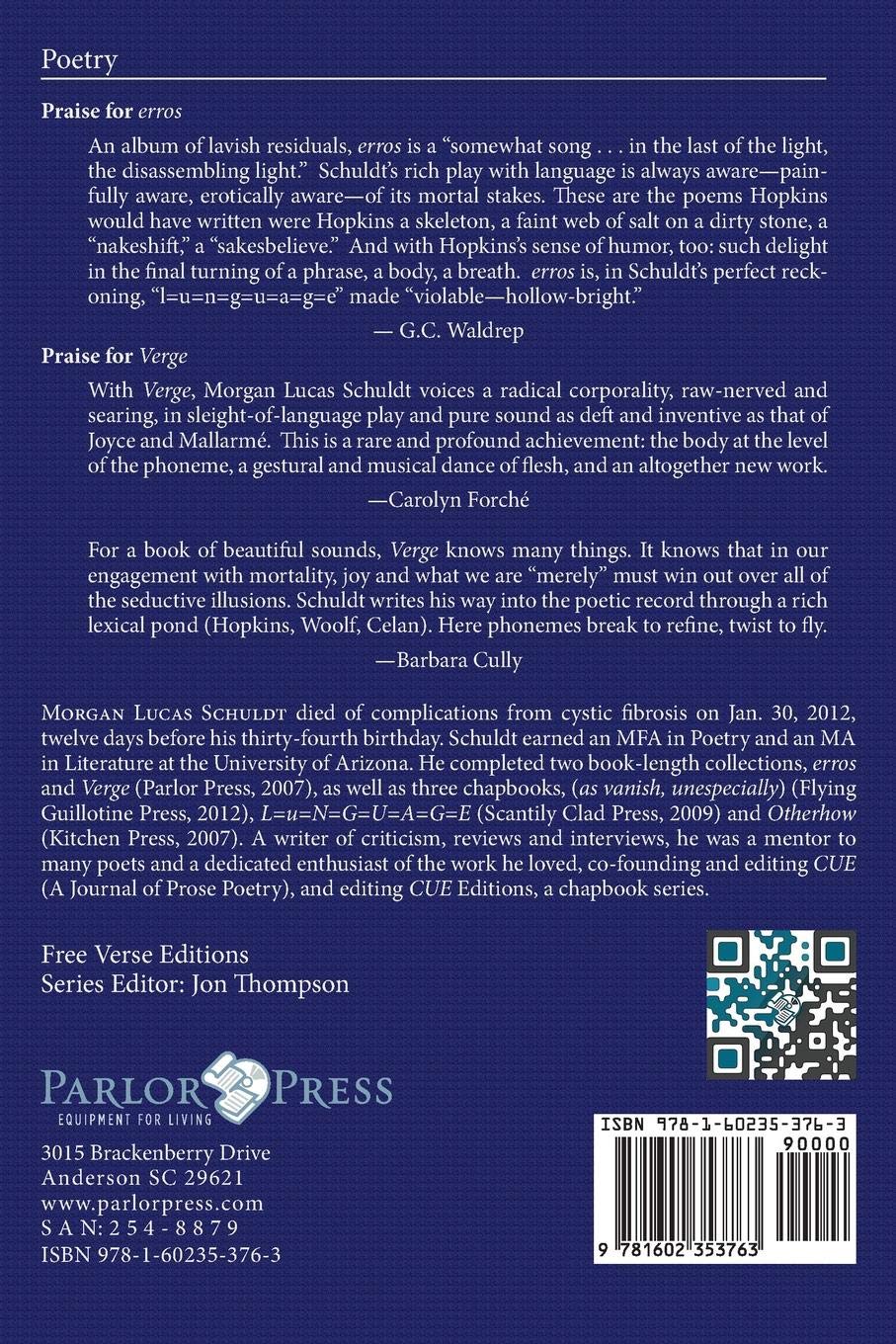 With Verge, Morgan Lucas Schuldt voices a radical corporality, raw-nerved and searing, in sleight-of-language play and pure sound as deft and inventive as that of Joyce and Mallarmé. This is a rare and profound achievement: the body at the level of the phoneme, a gestural and musical dance of flesh, and an altogether new work. — Carolyn Forché