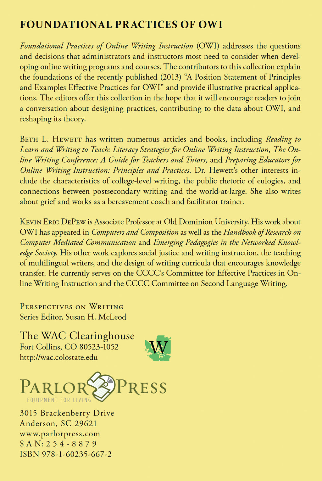 Foundational Practices of Online Writing Instruction (OWI) addresses the questions and decisions that administrators and instructors most need to consider when developing online writing programs and courses. Experts in the field (members of the Conference on College Composition and Communication Committee for Effective Practices in OWI and other experts and stakeholders), the authors explain the foundations of the recently published (2013) “A Position Statement of Principles and Examples Effective Practices for OWI” and provide illustrative practical applications. To that end, in every chapter, the authors uniquely address issues of inclusive and accessible writing instruction (based upon physical and mental disability, linguistic ability, and socioeconomic challenges) in technology enhanced settings. The five parts of this book attempt to cover the most key issues relevant to principle-centered OWI: (1) An OWI Primer, (2) OWI Pedagogy and Administrative Decisions, (3) Practicing Inclusivity in OWI, (4) Faculty and Student Preparation for OWI, and (5) New Directions in OWI. The editors believe that the field of writing studies is on a trajectory in which most courses will be mediated online to various degrees; therefore the principles detailed in this collection may become the basis for future writing instruction practices.  To this end, the editors hope that the guidance provided in the final two chapters, the questions that the previous sixteen chapters raise, and the desire to apply foundational practices for OWI in one’s own context will encourage readers to join this conversation by designing practices, contributing to the data about OWI, and reshaping its theory.