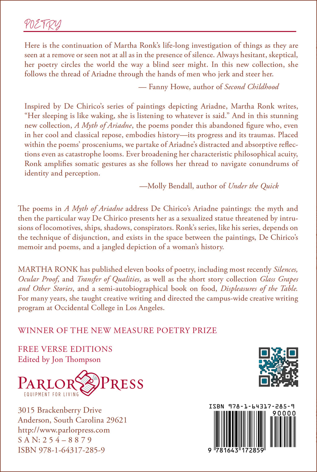 Inspired by De Chirico’s series of paintings depicting Ariadne, Martha Ronk writes, “Her sleeping is like waking, she is listening to whatever is said.” And in this stunning new collection, A Myth of Ariadne, the poems ponder this abandoned figure who, even in her cool and classical repose, embodies history—its progress and its traumas. Placed within the poems’ prosceniums, we partake of Ariadne’s distracted and absorptive reflections even as catastrophe looms. Ever broadening her characteristic philosophical acuity, Ronk amplifies somatic gestures as she follows her thread to navigate conundrums of identity and perception. —Molly Bendall, author of Under the Quick
