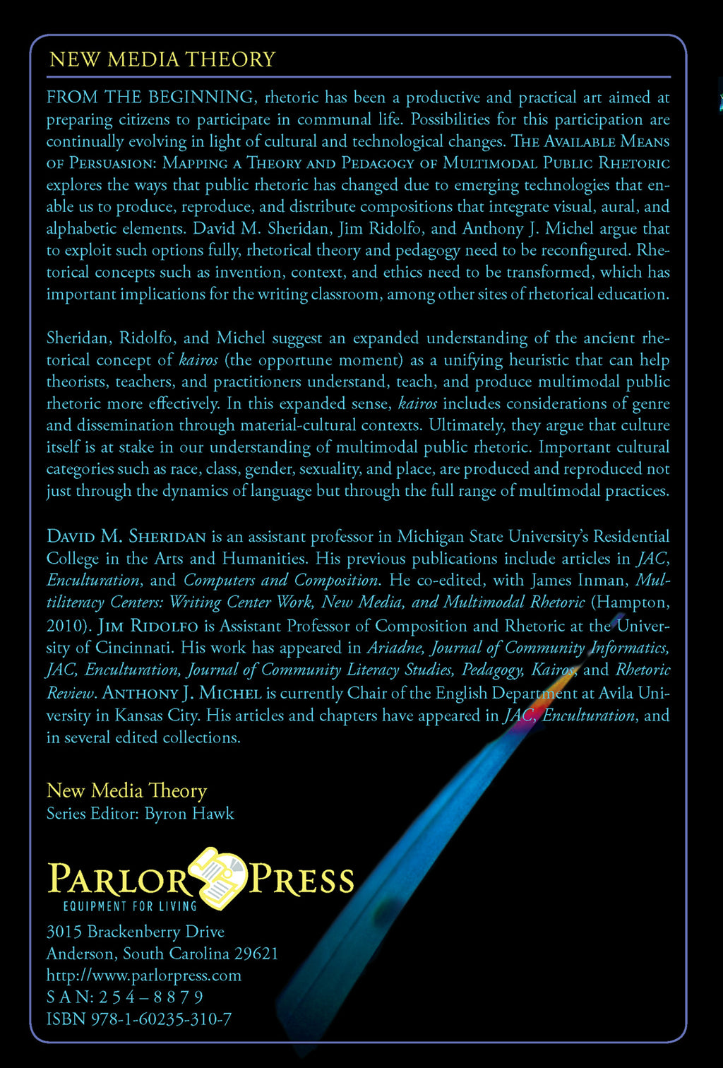 From the beginning, rhetoric has been a productive and practical art aimed at preparing citizens to participate in communal life. Possibilities for this participation are continually evolving in light of cultural and technological changes. The Available Means of Persuasion: Mapping a Theory and Pedagogy of Multimodal Public Rhetoric explores the ways that public rhetoric has changed due to emerging technologies that enable us to produce, reproduce, and distribute compositions that integrate visual, aural, and alphabetic elements. David M. Sheridan, Jim Ridolfo, and Anthony J. Michel argue that to exploit such options fully, rhetorical theory and pedagogy need to be reconfigured. Rhetorical concepts such as invention, context, and ethics need to be transformed, which has important implications for the writing classroom, among other sites of rhetorical education.