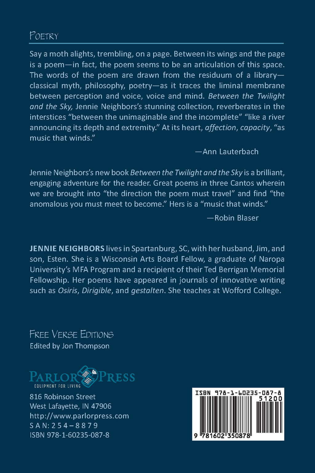 Say a moth alights, trembling, on a page. Between its wings and the page is a poem—in fact, the poem seems to be an articulation of this space. The words of the poem are drawn from the residuum of a library—classical myth, philosophy, poetry—as it traces the liminal membrane between perception and voice, voice and mind. Between the Twilight and the Sky, Jennie Neighbors’s stunning collection, reverberates in the interstices “between the unimaginable and the incomplete” “like a river announcing its depth and extremity.” At its heart, affection, capacity, “as music that winds.” —Ann Lauterbach