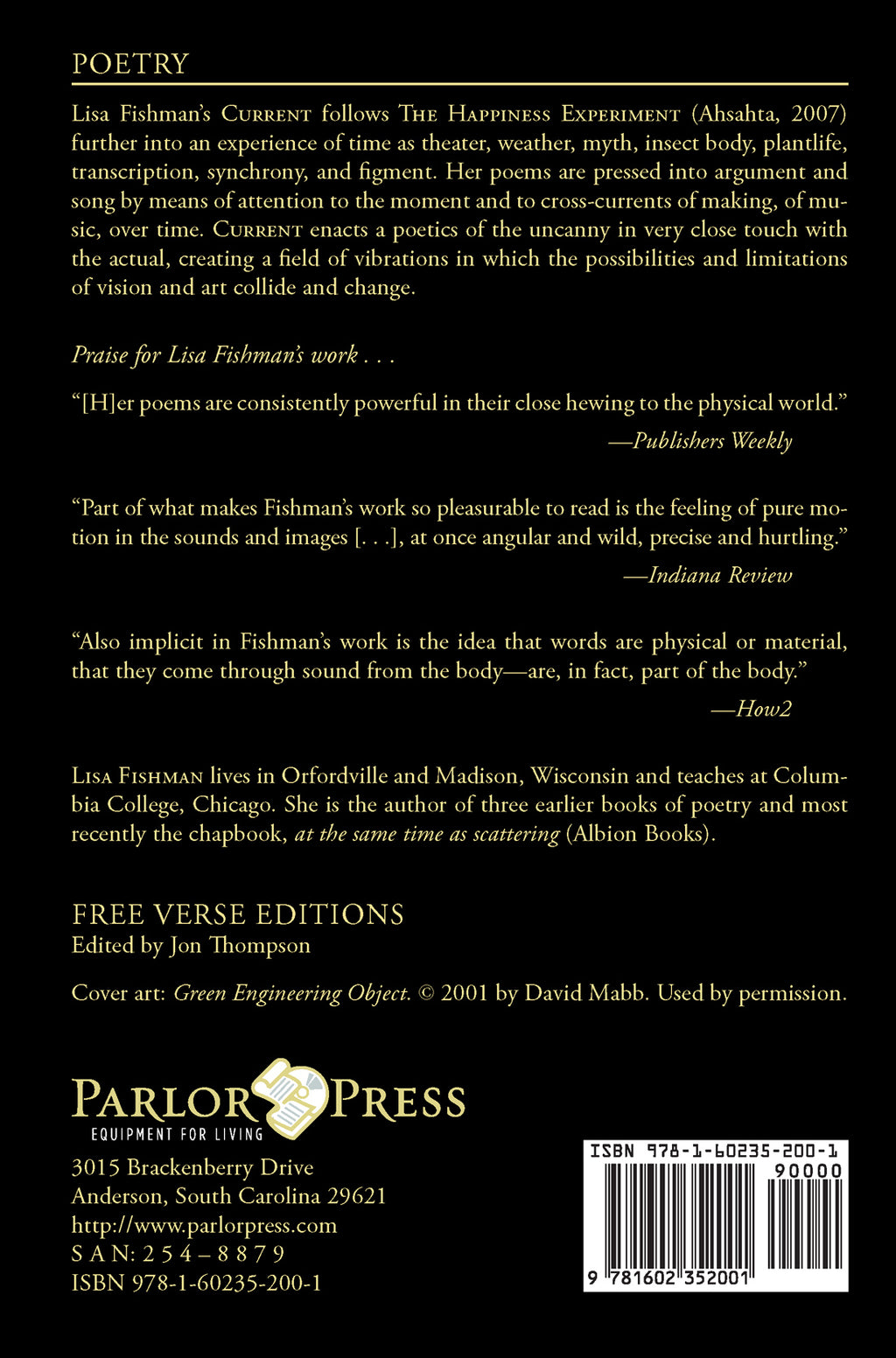 Lisa Fishman's Current follows The Happiness Experiment (Ahsahta, 2007) further into an experience of time as theater, weather, myth, insect body, plantlife, transcription, synchrony, and figment. Her poems are pressed into argument and song by means of attention to the moment and to cross-currents of making, of music, over time. Current enacts a poetics of the uncanny in very close touch with the actual, creating a field of vibrations in which the possibilities and limitations of vision and art collide and change.