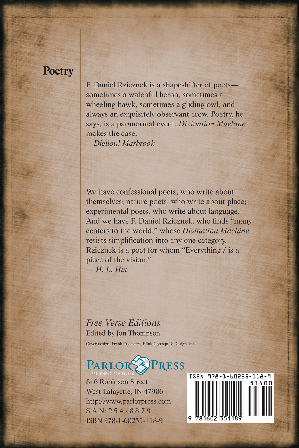 F. Daniel Rzicznek is a shapeshifter of poets—sometimes a watchful heron, sometimes a wheeling hawk, sometimes a gliding owl, and always an exquisitely observant crow. Poetry, he says, is a paranormal event. Divination Machine makes the case.