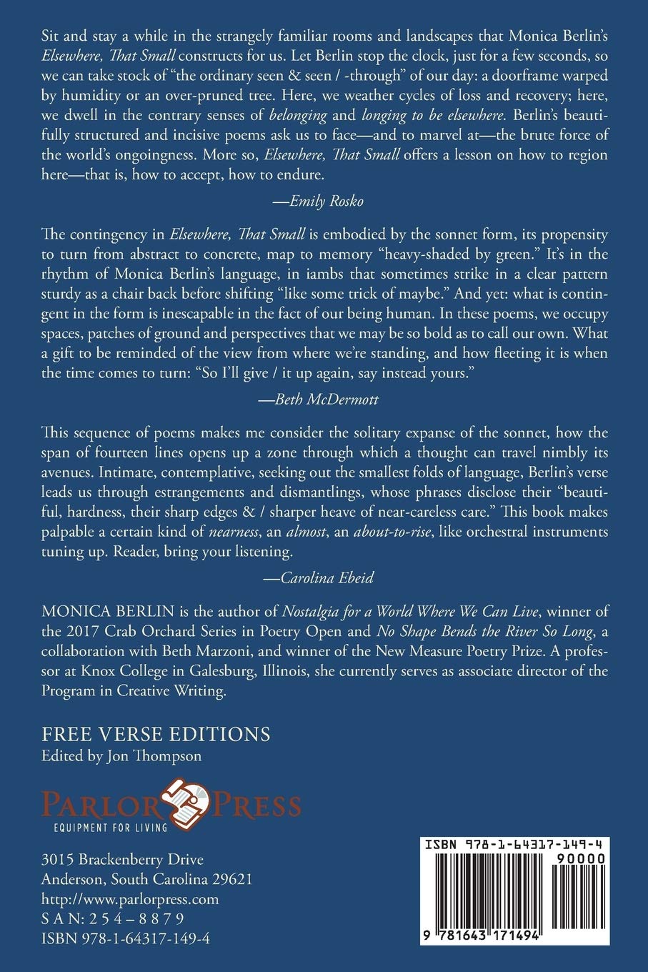 Sit and stay a while in the strangely familiar rooms and landscapes that Monica Berlin’s Elsewhere, That Small construct for us. Let Berlin stop the clock, just for a few seconds, so we can take stock of “the ordinary seen & seen / -through” of our day: a doorframe warped by humidity or an over-pruned tree. Here, we weather cycles of loss and recovery; here, we dwell in the contrary senses of belonging and longing to be elsewhere. Berlin’s beautifully structured and incisive poems ask us to face—and to marvel at—the brute force of the world’s ongoingness. More so, Elsewhere, That Small offers a lesson on how to region here—that is, how to accept, how to endure—as Berlin writes, “Maybe / the only way to understand emptiness / wholly: to live in it.” —Emily Rosko