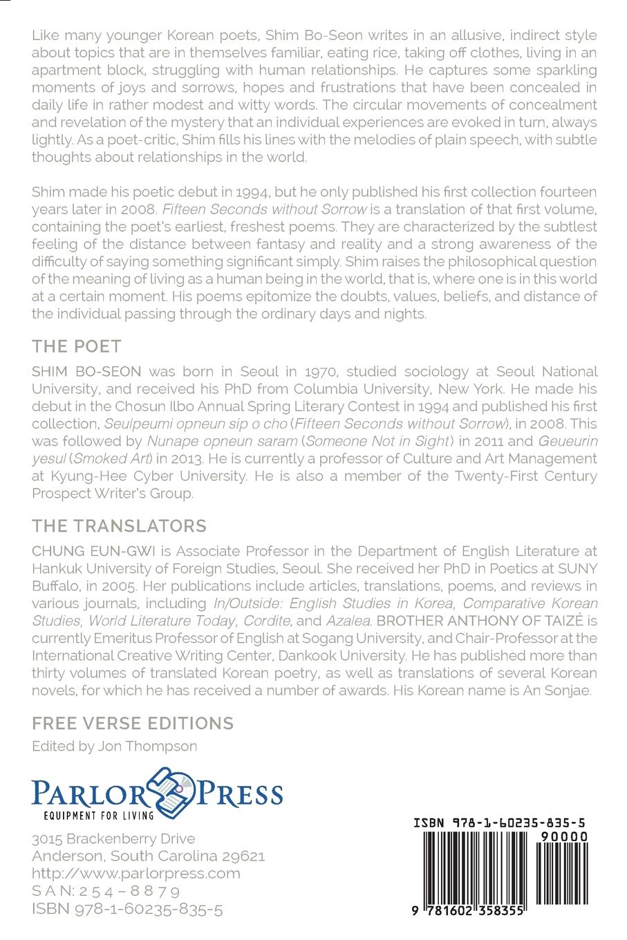 Shim made his poetic debut in 1994, but he only published his first collection fourteen years later in 2008. Fifteen Seconds without Sorrow is a translation of that first volume, containing the poet's earliest, freshest poems. They are characterized by the subtlest feeling of the distance between fantasy and reality and a strong awareness of the difficulty of saying something significant simply. Shim raises the philosophical question of the meaning of living as a human being in the world, that is, where one is in this world at a certain moment. His poems epitomize the doubts, values, beliefs, and distance of the individual passing through the ordinary days and nights.