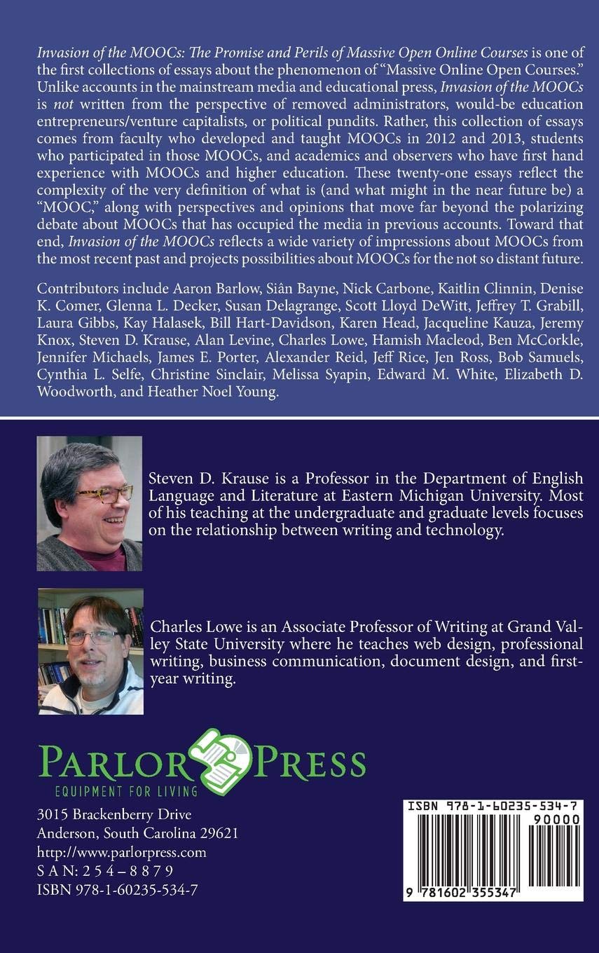 Invasion of the MOOCs: The Promise and Perils of Massive Open Online Courses is one of the first collections of essays about the phenomenon of “Massive Online Open Courses.” Unlike accounts in the mainstream media and educational press, Invasion of the MOOCs is not written from the perspective of removed administrators, would-be education entrepreneurs/venture capitalists, or political pundits. Rather, this collection of essays comes from faculty who developed and taught MOOCs in 2012 and 2013, students who participated in those MOOCs, and academics and observers who have first hand experience with MOOCs and higher education. These twenty-one essays reflect the complexity of the very definition of what is (and what might in the near future be) a “MOOC,” along with perspectives and opinions that move far beyond the polarizing debate about MOOCs that has occupied the media in previous accounts. Toward that end, Invasion of the MOOCs reflects a wide variety of impressions about MOOCs from the most recent past and projects possibilities about MOOCs for the not so distant future.