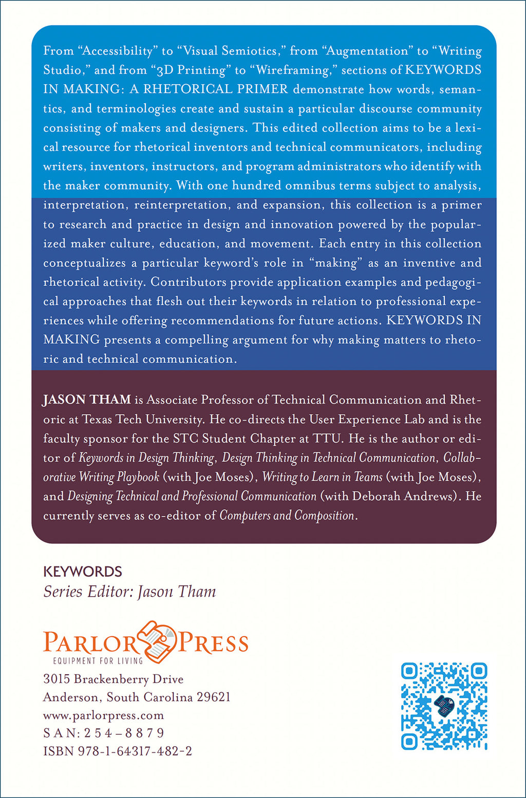 From “Accessibility” to “Visual Semiotics,” from “Augmentation” to “Writing Studio,” and from “3D Printing” to “Wireframing,” major sections of Keywords in Making demonstrate how words, semantics, and terminologies create and sustain a particular discourse community consisting of makers and designers. This edited collection aims to be a lexical resource for rhetorical inventors and technical communicators, including writers, inventors, instructors, and program administrators who identify with the maker community. With one hundred omnibus terms subject to analysis, interpretation, reinterpretation, and expansion, this collection is a primer to research and practice in design and innovation powered by the popularized maker culture, education, and movement. Each entry in this collection conceptualizes a particular keyword’s role in “making” as an inventive and rhetorical activity. Contributors provide application examples and pedagogical approaches that flesh out their keywords in relation to professional experiences while offering recommendations for future actions. Keywords in Making presents a compelling argument for why making matters to rhetoric and technical communication.