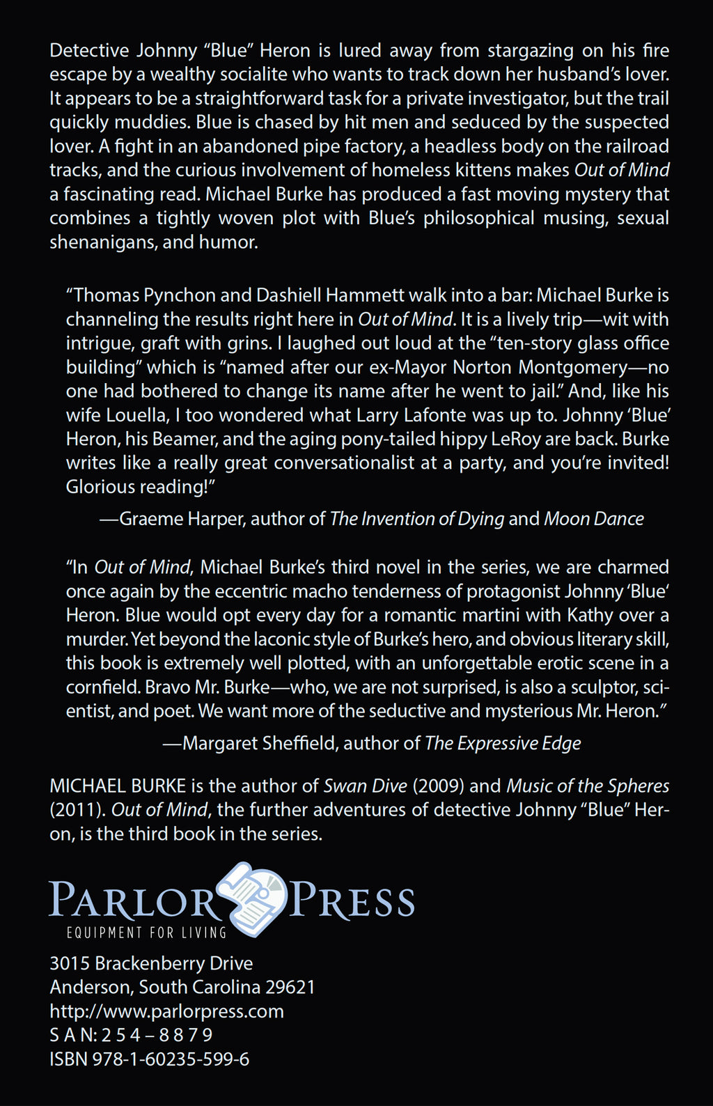 “Thomas Pynchon and Dashiell Hammett walk into a bar: Michael Burke is channeling the results right here in Out of Mind. It is a lively trip—wit with intrigue, graft with grins. I laughed out loud at the “ten-story glass office building” which is “named after our ex-Mayor Norton Montgomery—no one had bothered to change its name after he went to jail.” And, like his wife Louella, I too wondered what Larry Lafonte was up to. Johnny ‘Blue’ Heron, his Beamer, and the aging pony-tailed hippy LeRoy are back. Burke writes like a really great conversationalist at a party, and you’re invited! Glorious reading!”