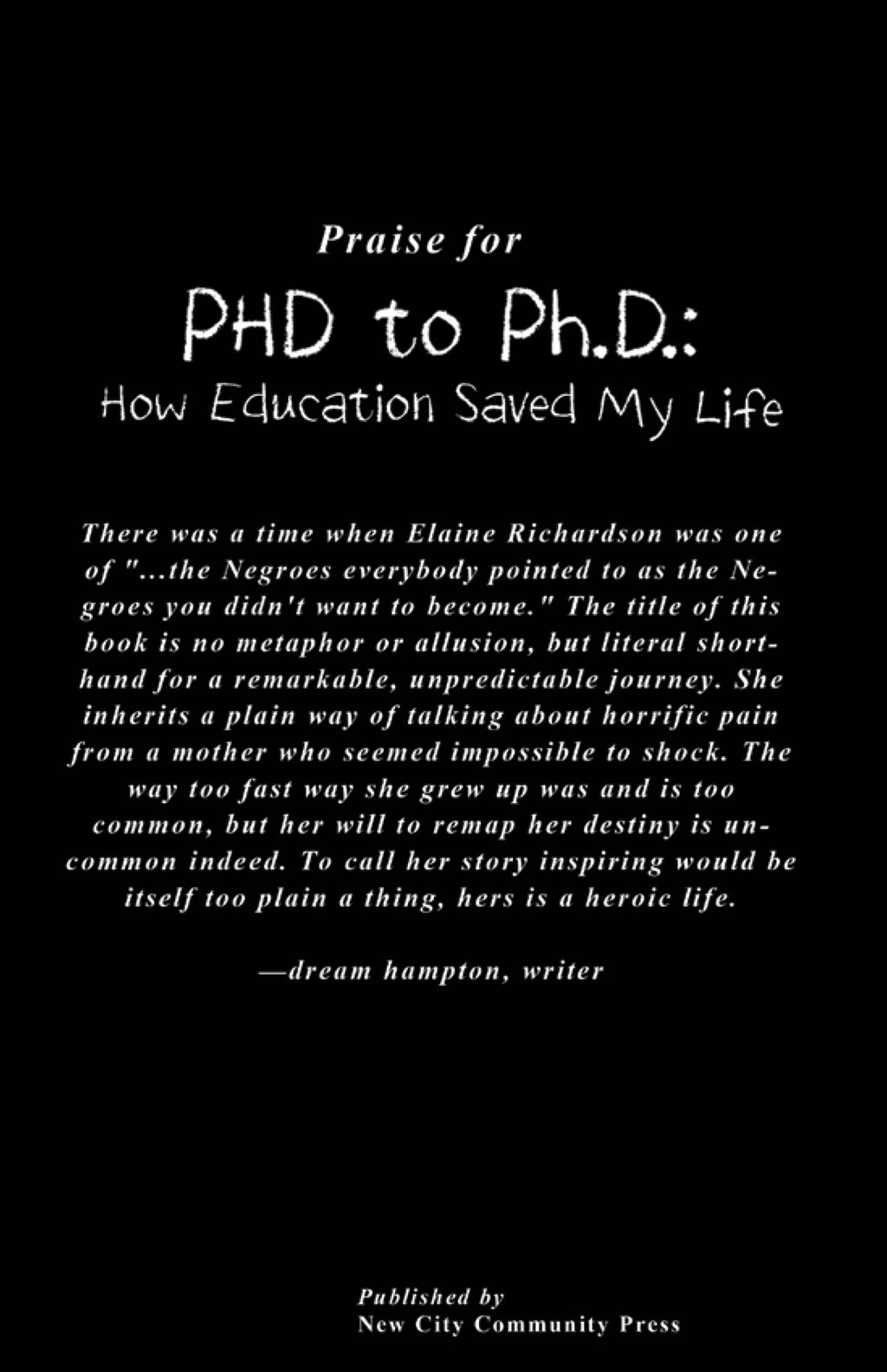 A deeply revealing, emotional and inspiring memoir, PHD (Po H# on Dope) to PhD: How Education Saved My Life is a must read for everyone, especially young women. —R. Lee Gamble, Phenomenal Woman Magazine (June, 2013, p. 6)