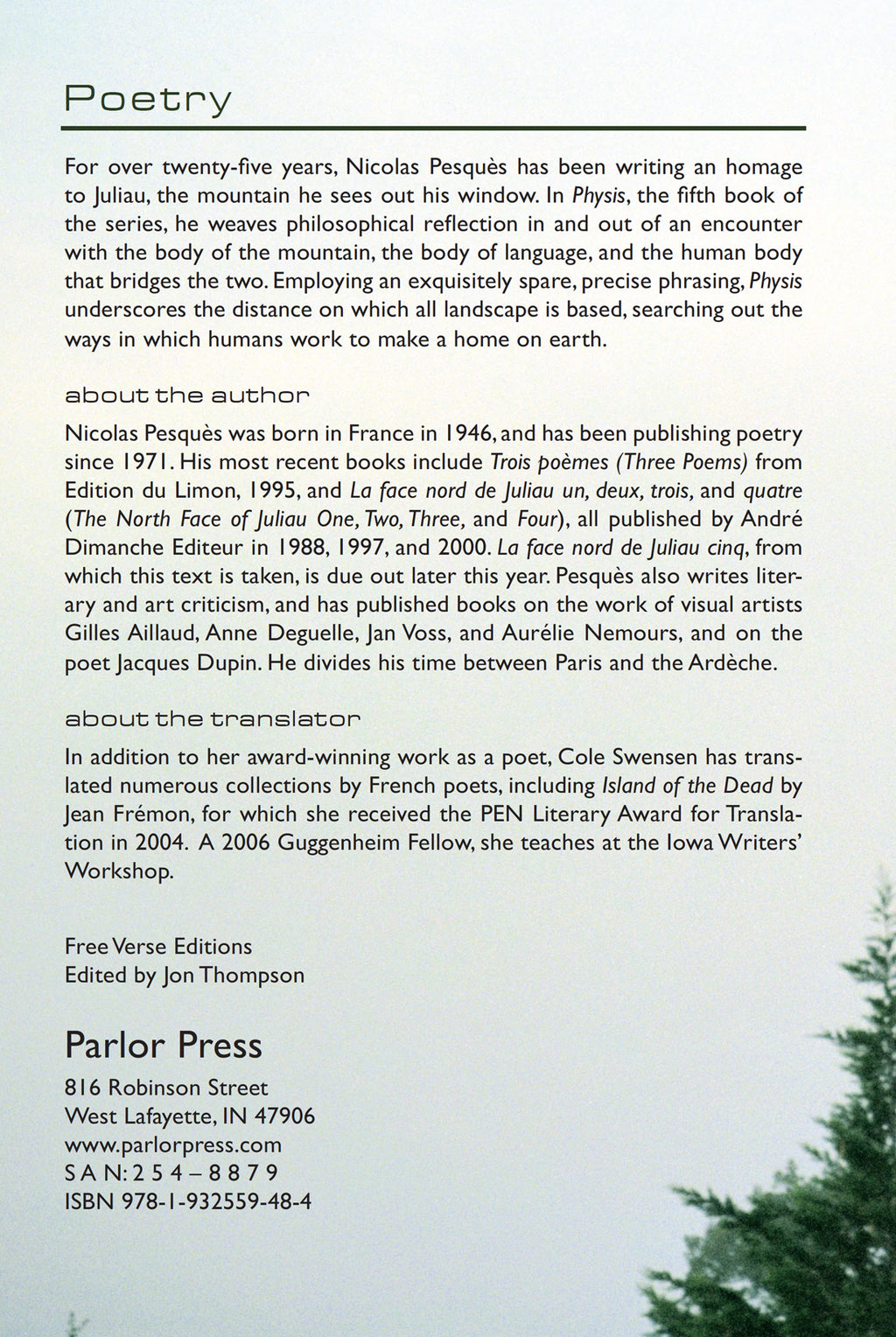 For over twenty-five years, Nicolas Pesquès has been writing an homage to Juliau, the mountain he sees out his window. In Physis, the fifth book of the series, he weaves philosophical reflection in and out of an encounter with the body of the mountain, the body of language, and the human body that bridges the two. Employing an exquisitely spare, precise phrasing, Physis underscores the distance on which all landscape is based, searching out the ways in which humans work to make a home on earth.
