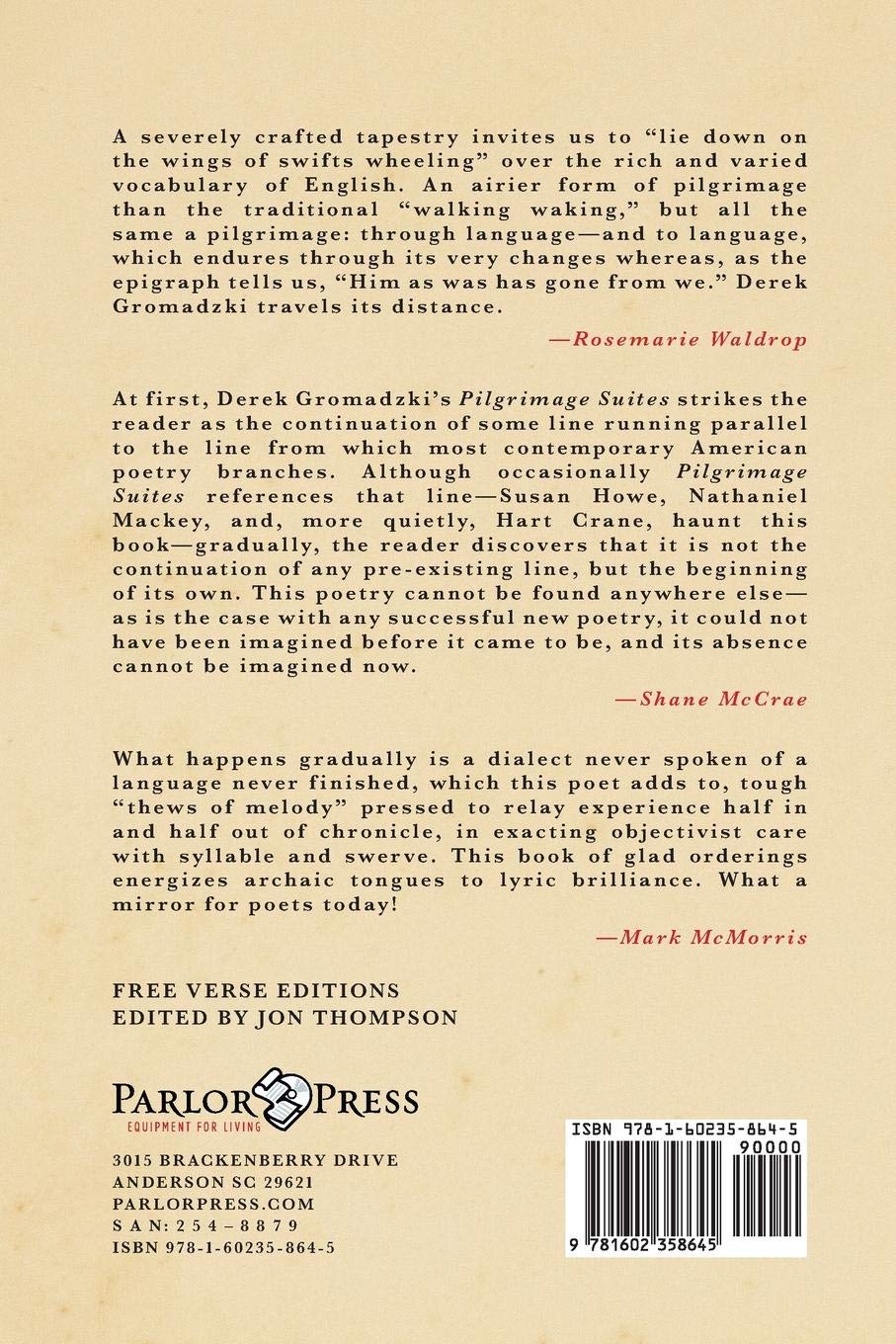 At first, Derek Gromadzki’s Pilgrimage Suites strikes the reader as the continuation of some line running parallel to the line from which most contemporary American poetry branches. Although occasionally Pilgrimage Suites references that line—Susan Howe, Nathaniel Mackey, and, more quietly, Hart Crane, haunt this book—gradually, the reader discovers that it is not the continuation of any pre-existing line, but the beginning of its own. This poetry cannot be found anywhere else—as is the case with any successful new poetry, it could not have been imagined before it came to be, and its absence cannot be imagined now. —Shane McCrae