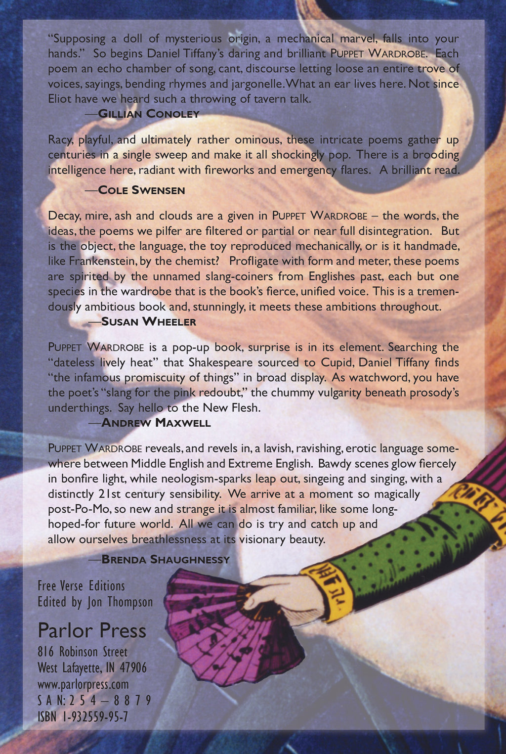 "Supposing a doll of mysterious origin, a mechanical marvel, falls into your hands." So begins Daniel Tiffany's daring and brilliant Puppet Wardrobe. Each poem an echo chamber of song, cant, discourse letting loose an entire trove of voices, sayings, bending rhymes and jargonelle. What an ear lives here. Not since Eliot have we heard such a throwing of tavern talk.