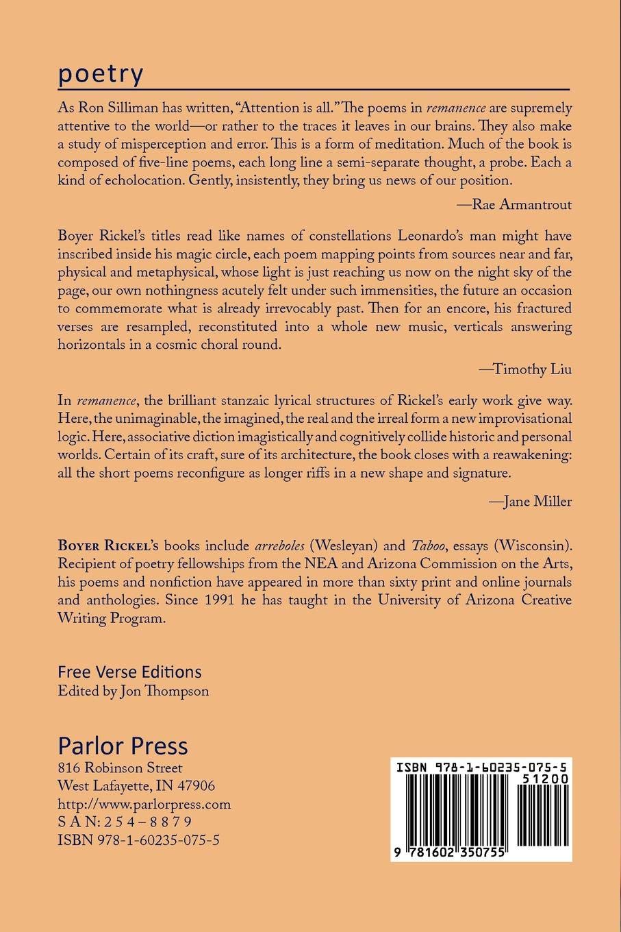 In remanence, the brilliant stanzaic lyrical structures of Rickel’s early work give way. Here, the unimaginable, the imagined, the real and the irreal form a new improvisational logic. Here, associative diction imagistically and cognitively collide historic and personal worlds. Certain of its craft, sure of its architecture, the book closes with a reawakening: all the short poems reconfigure as longer riffs in a new shape and signature.