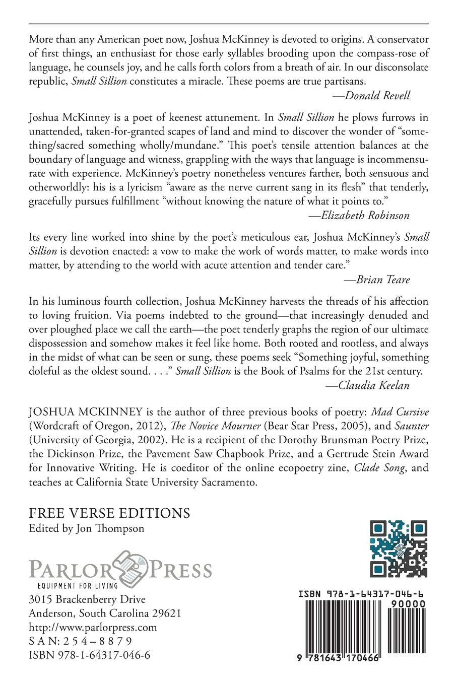 Joshua McKinney's fourth collection, Small Sillion, enacts a lyric struggle to perceive the numinous in a world marked by violence. The term sillion, as used by Hopkins in his famous poem, "The Windhover," refers to a furrow turned over by a plough. For McKinney it is both prelude to fertility, and wound, a scarring of the land. Maintaining a tension between the visionary and the mundane, between joy and despair, these poems posit a border between language and the living world; they constitute a personal eco-poetics of skepticism, one that respects language's utility and radiance, while acknowledging that the world's complexity lies beyond the grasp of language