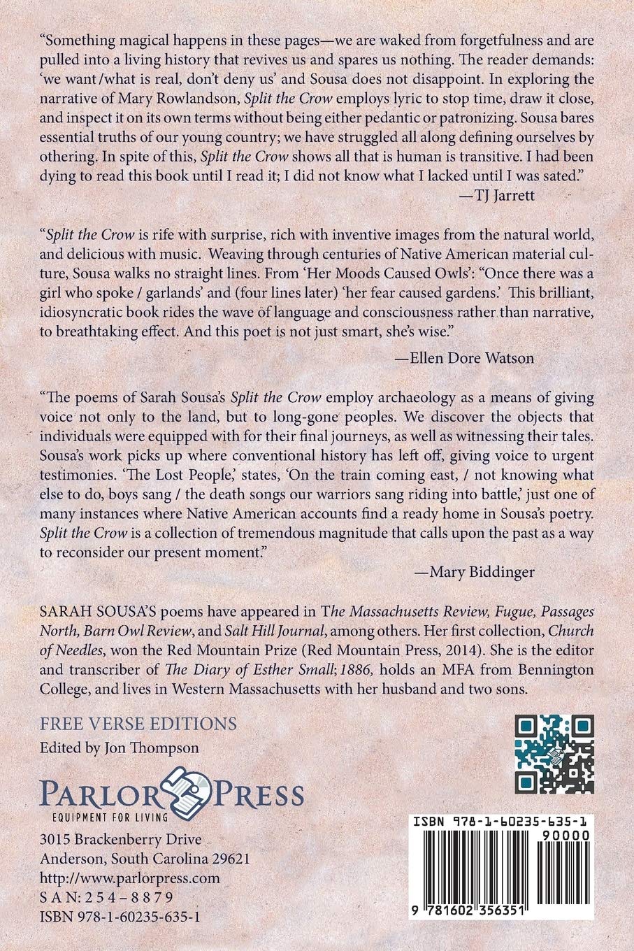 "Something magical happens in these pages—we are waked from forgetfulness and are pulled into a living history that revives us and spares us nothing. The reader demands: 'we want /what is real, don't deny us' and Sousa does not disappoint. In exploring the narrative of Mary Rowlandson, Split the Crow employs lyric to stop time, draw it close, and inspect it on its own terms without being either pedantic or patronizing. Sousa bares essential truths of our young country; we have struggled all along defining ourselves by othering. In spite of this, Split the Crow shows all that is human is transitive. I had been dying to read this book until I read it; I did not know what I lacked until I was sated."