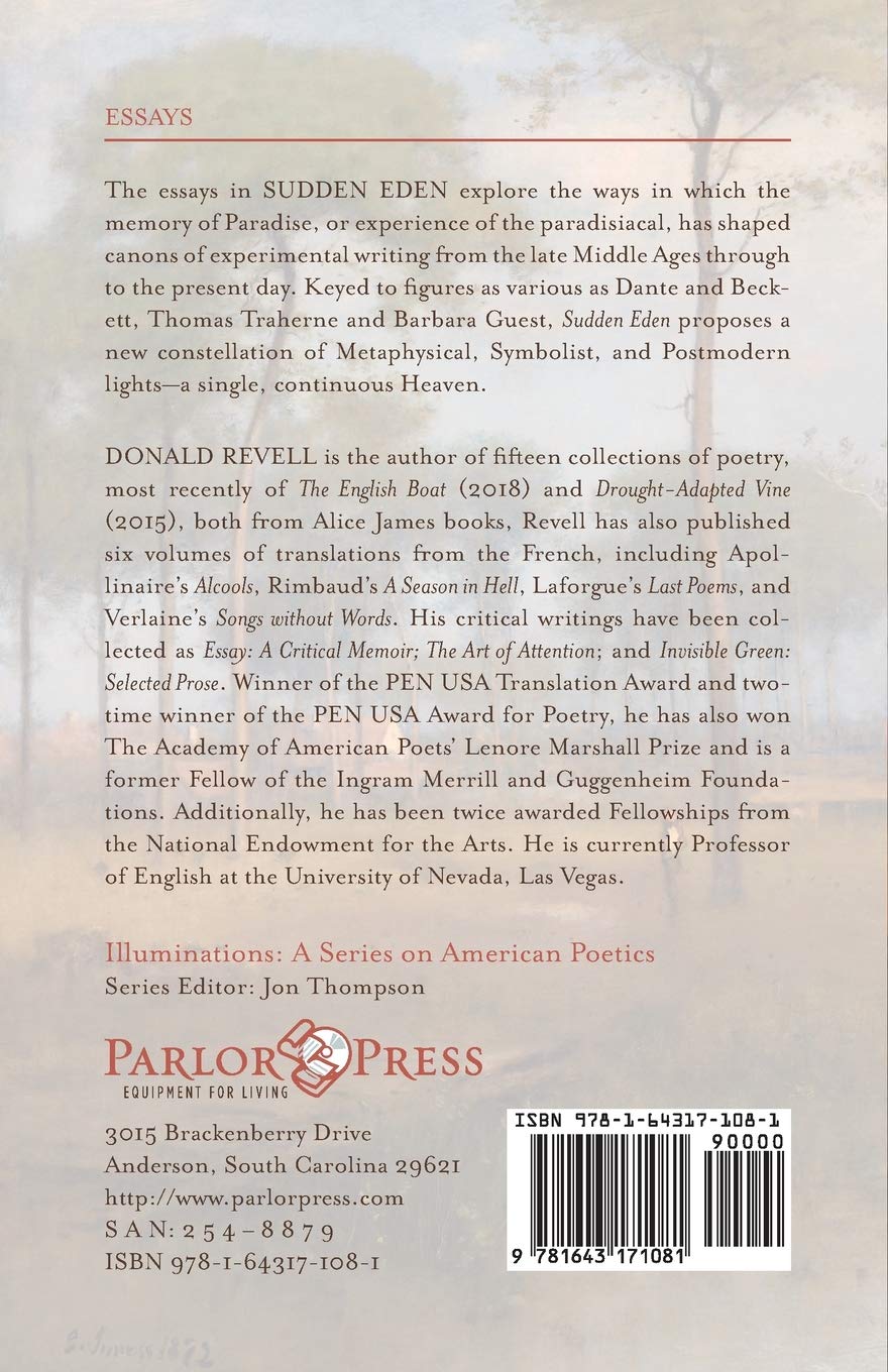 The essays in Sudden Eden explore the ways in which the memory of Paradise, or experience of the paradisiacal, has shaped canons of experimental writing from the late Middle Ages through to the present day. Keyed to figures as various as Dante and Beckett, Thomas Traherne and Barbara Guest, Sudden Eden proposes a new constellation of Metaphysical, Symbolist, and Postmodern lights—a single, continuous Heaven.