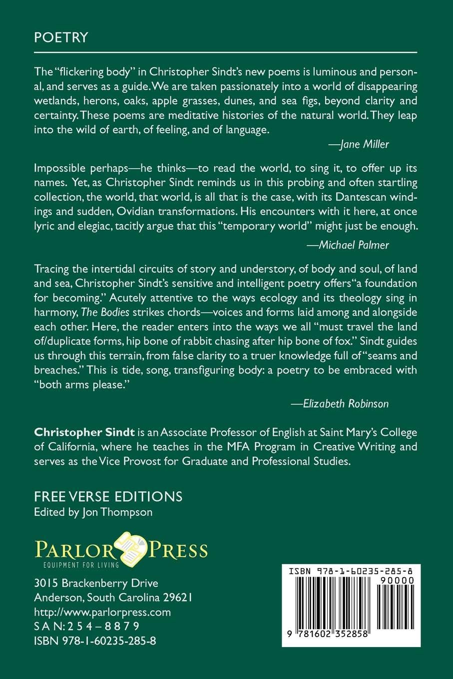 Tracing the intertidal circuits of story and understory, of body and soul, of land and sea, Christopher Sindt’s sensitive and intelligent poetry offers “a foundation for becoming.”  Acutely attentive to the ways ecology and its theology sing in harmony, The Bodies strikes chords—voices and forms laid among and alongside each other.  Here, the reader enters into the ways we all “must travel the land of/duplicate forms, hip bone of rabbit chasing after hip bone of fox.”  Sindt guides us through this terrain, from false clarity to a truer knowledge full of “seams and breaches.”  This is tide, song,  transfiguring body: a poetry to be embraced with “both arms please.” —Elizabeth Robinson