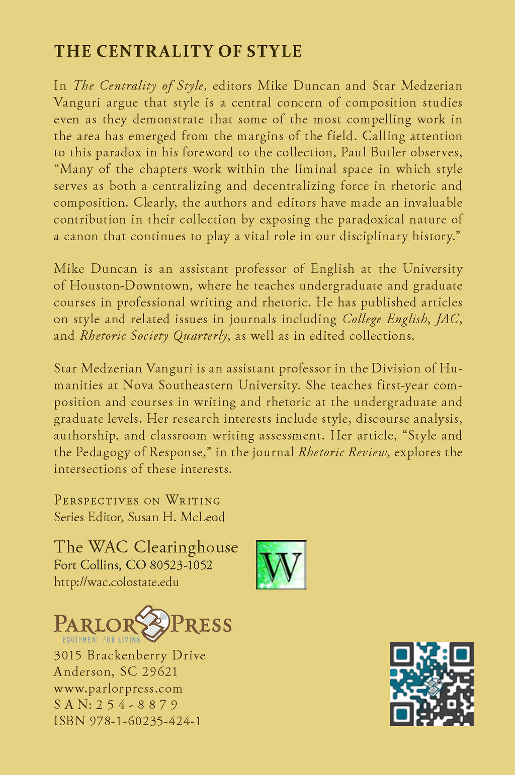 In The Centrality of Style, editors Mike Duncan and Star Medzerian Vanguri argue that style is a central concern of composition studies even as they demonstrate that some of the most compelling work in the area has emerged from the margins of the field. Calling attention to this paradox in his foreword to the collection, Paul Butler observes, “Many of the chapters work within the liminal space in which style serves as both a centralizing and decentralizing force in rhetoric and composition. Clearly, the authors and editors have made an invaluable contribution in their collection by exposing the paradoxical nature of a canon that continues to play a vital role in our disciplinary history.” Contributors include Nora Bacon, Jonathan Buehl, Paul Butler, Rosanne Carlo, Mike Duncan, Erik Ellis, William FitzGerald, Crystal Fodrey, Moe Folk, Russell Greer, Chris Holcomb, M. Jimmie Killingsworth, William C. Kurlinkus, Zak Lancaster, Tom Pace, Luke Redington, Keith Rhodes, Denise Stodola, and Star Medzerian Vanguri.