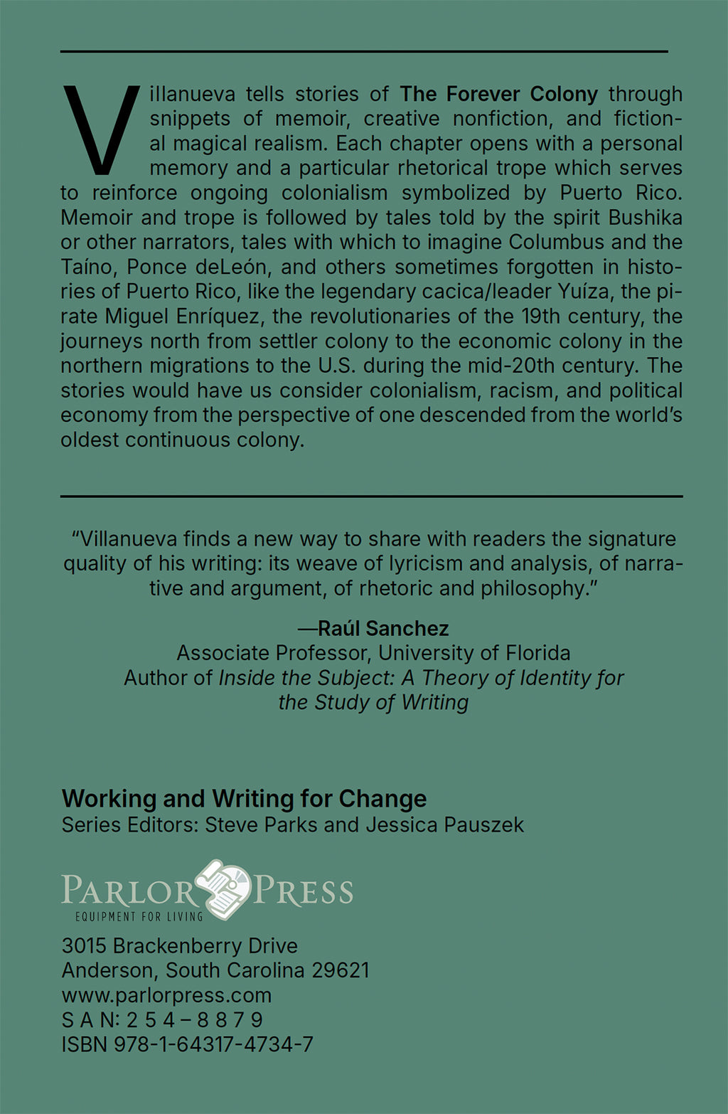 Victor Villanueva tells stories of The Forever Colony through snippets of memoir, creative nonfiction, and fictional magical realism. Each chapter opens with a personal memory and a particular rhetorical trope that reinforces the ongoing colonialism symbolized by Puerto Rico. Memoir and trope are followed by tales told by the spirit Bushika or other narrators, tales with which to imagine Columbus and the Taíno, Ponce deLeón, and others sometimes forgotten in histories of Puerto Rico, like the legendary cacica/leader Yuíza, the pirate Miguel Enríquez, the revolutionaries of the 19th century, the journeys north from settler colony to the economic colony in the northern migrations to the U.S. during the mid-20th century. The stories would have us consider colonialism, racism, and political economy from the perspective of one descended from the world’s oldest continuous colony.