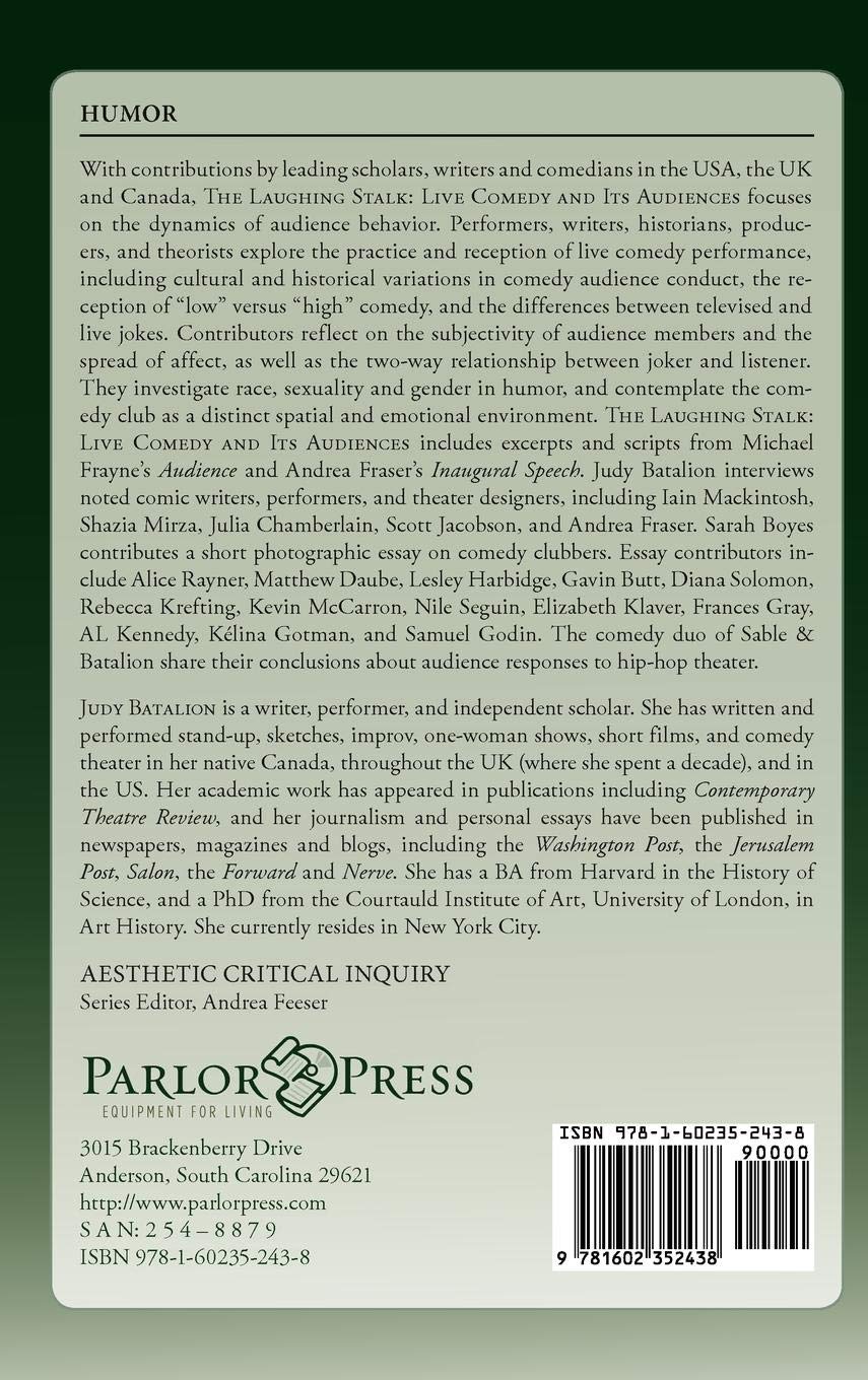 With contributions by leading scholars, writers and comedians in the USA, the UK and Canada, The Laughing Stalk: Live Comedy and Its Audiences focuses on the dynamics of audience behavior. Performers, writers, historians, producers, and theorists explore the practice and reception of live comedy performance, including cultural and historical variations in comedy audience conduct, the reception of “low” versus “high” comedy, and the differences between televised and live jokes. Contributors reflect on the subjectivity of audience members and the spread of affect, as well as the two-way relationship between joker and listener. They investigate race, sexuality and gender in humor, and contemplate the comedy club as a distinct spatial and emotional environment. The Laughing Stalk: Live Comedy and Its Audiences includes excerpts and scripts from Michael Frayne’s Audience and Andrea Fraser’s Inaugural Speech. Judy Batalion interviews noted comic writers, performers, and theater designers, including Iain Mackintosh, Shazia Mirza, Julia Chamberlain, Scott Jacobson, and Andrea Fraser. Sarah Boyes contributes a short photographic essay on comedy clubbers. Essay contributors include Alice Rayner, Matthew Daube, Lesley Harbidge, Gavin Butt, Diana Solomon, Rebecca Krefting, Kevin McCarron, Nile Seguin, Elizabeth Klaver, Frances Gray, AL Kennedy, Kélina Gotman, and Samuel Godin. The comedy duo of Sable & Batalion share their conclusions about audience responses to hip-hop theater.