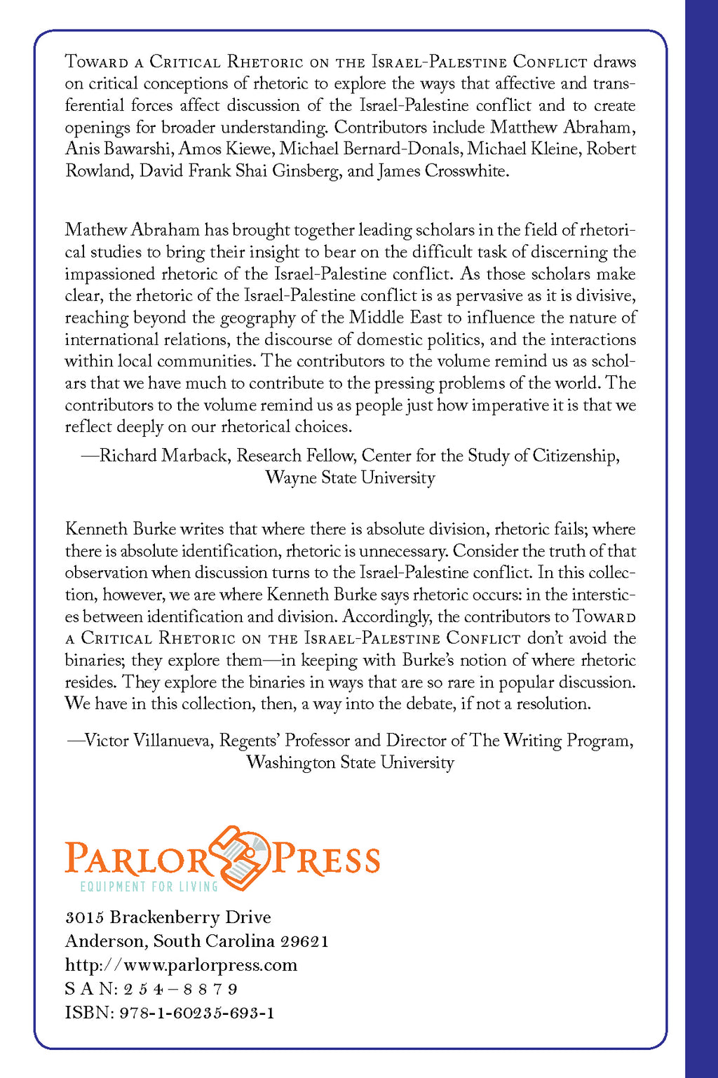 Kenneth Burke writes that where there is absolute division, rhetoric fails; where there is absolute identification, rhetoric is unnecessary. Consider the truth of that observation when discussion turns to the Israel-Palestine conflict. In this collection, however, we are where Kenneth Burke says rhetoric occurs: in the interstices between identification and division. Accordingly, the contributors to Toward a Critical Rhetoric on the Israel-Palestine Conflict don't avoid the binaries; they explore them—in keeping with Burke's notion of where rhetoric resides. They explore the binaries in ways that are so rare in popular discussion. We have in this collection, then, a way into the debate, if not a resolution.