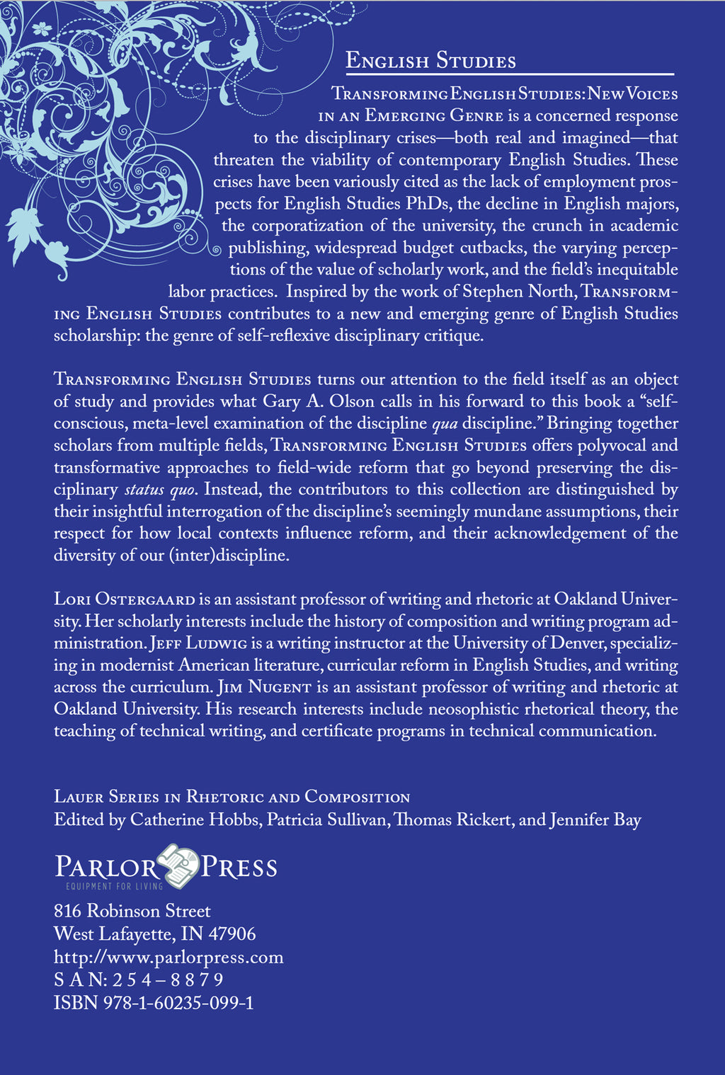 Transforming English Studies: New Voices in an Emerging Genre is a concerned response to the disciplinary crises—both real and imagined—that threaten the viability of contemporary English Studies. These crises have been variously cited as the lack of employment prospects for English Studies PhDs, the decline in English majors, the corporatization of the university, the crunch in academic publishing, widespread budget cutbacks, the varying perceptions of the value of scholarly work, and the field’s inequitable labor practices. Inspired by the work of Stephen North, Transforming English Studies contributes to a new and emerging genre of English Studies scholarship: the genre of self-reflexive disciplinary critique.