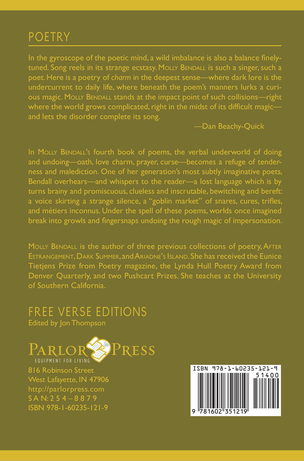 In the gyroscope of the poetic mind, a wild imbalance is also a balance finely-tuned. Song reels in its strange ecstasy. Molly Bendall is such a singer, such a poet. Here is a poetry of charm in the deepest sense—where dark lore is the undercurrent to daily life, where beneath the poem's manners lurks a curious magic. Molly Bendall stands at the impact point of such collisions—right where the world grows complicated, right in the midst of its difficult magic—and lets the disorder complete its song.
