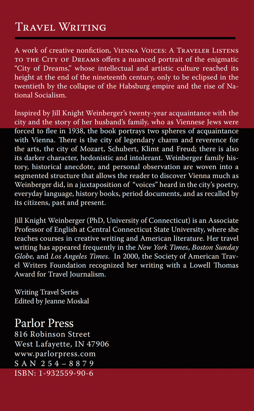 In Vienna Voices, Jill Knight Weinberger offers the reader not just the insights of a sophisticated and seasoned traveler but much more: a love story about a remarkable city and a complex heritage. The book is delightfully structured in photographically lucid vignettes woven together by the reflections of a mature and compassionate intelligence. The author has managed to use personal history as a window on a public history that includes Sigmund Freud, Nazis, and Jewish refugees, set to a musical score by Beethoven and Mozart. Altogether a rich and satisfying book. —Philip Gerard, author of Creative Nonfiction: Researching and Creating Stories of Real Life and co-editor (with Carolyn Forche) of Creative Nonfiction
