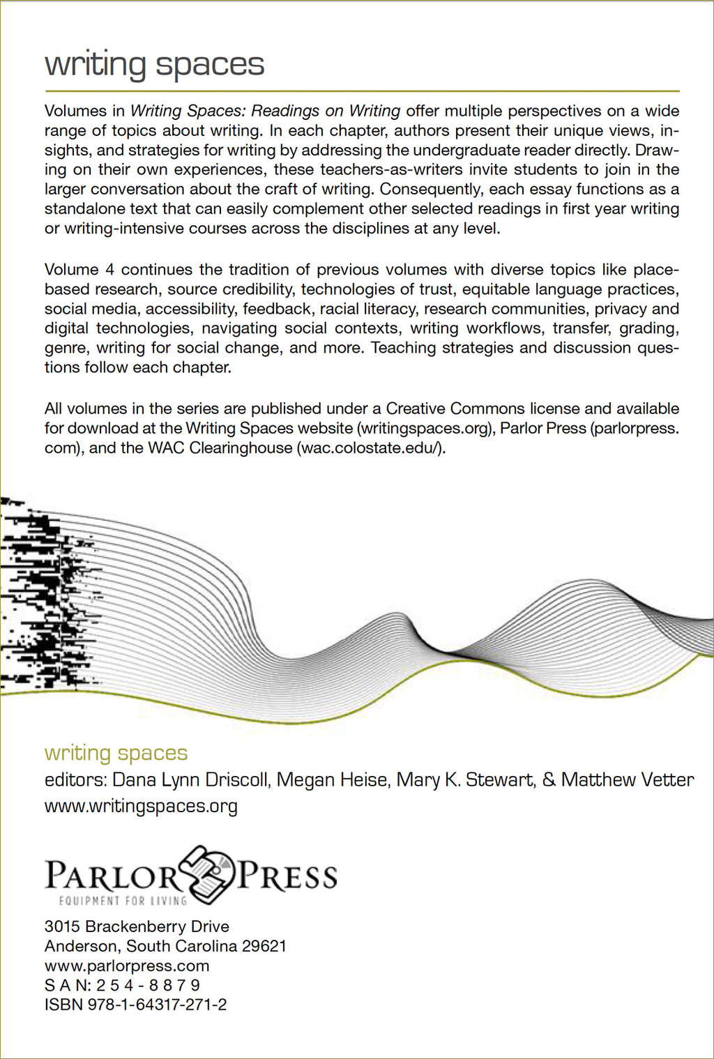 All volumes in the series are published under a Creative Commons license and available for download at the Writing Spaces website (www.writingspaces.org), Parlor Press (www.parlorpress.com), and the WAC Clearinghouse (wac.colostate.edu/).